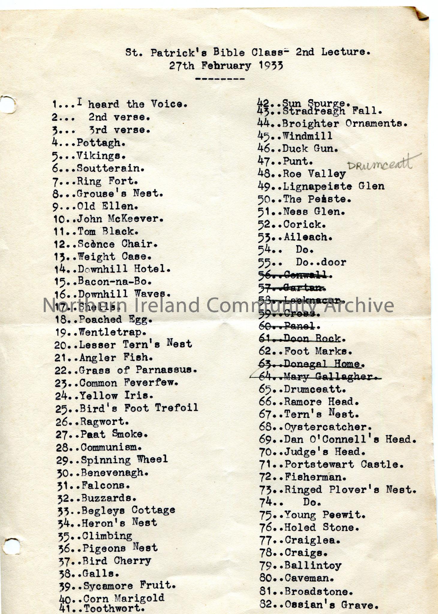 Page 1 of 2 of typed list, possibly slides, titled, ‘St. Patrick’s Bible Class – 2nd Lecture. 27th February 1933’. Numbered 1-82 on first page and 83-…