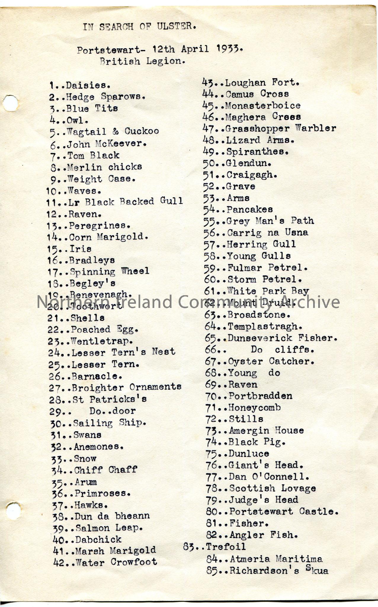 Page 1 of 2 of typed list, possibly slides to go with a lecture, titled, 'In Search of Ulster. Portstewart - 12th April 1933. British Legion'. Slides numbered 1-85.