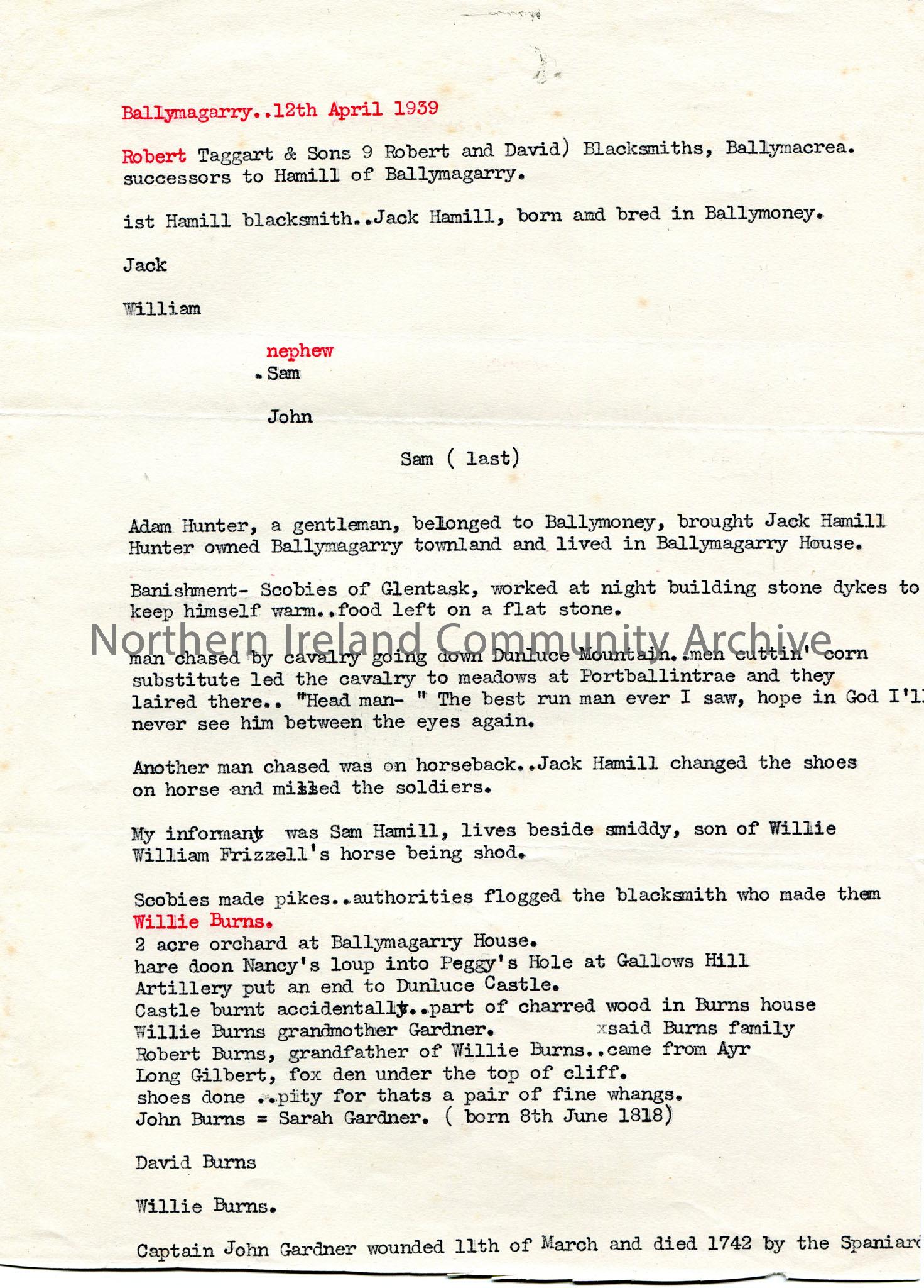 Page 1 of 2 of typed notes re Ballymagarry and Ballymagarry House. Dated 12th April, 1939. Mentions Robert Taggart; Jack Hamill of Ballymoney. Adam Hunter of Ballymoney owned Ballymagarry townland and lived in Ballymagarry House. Notes re Burns family.