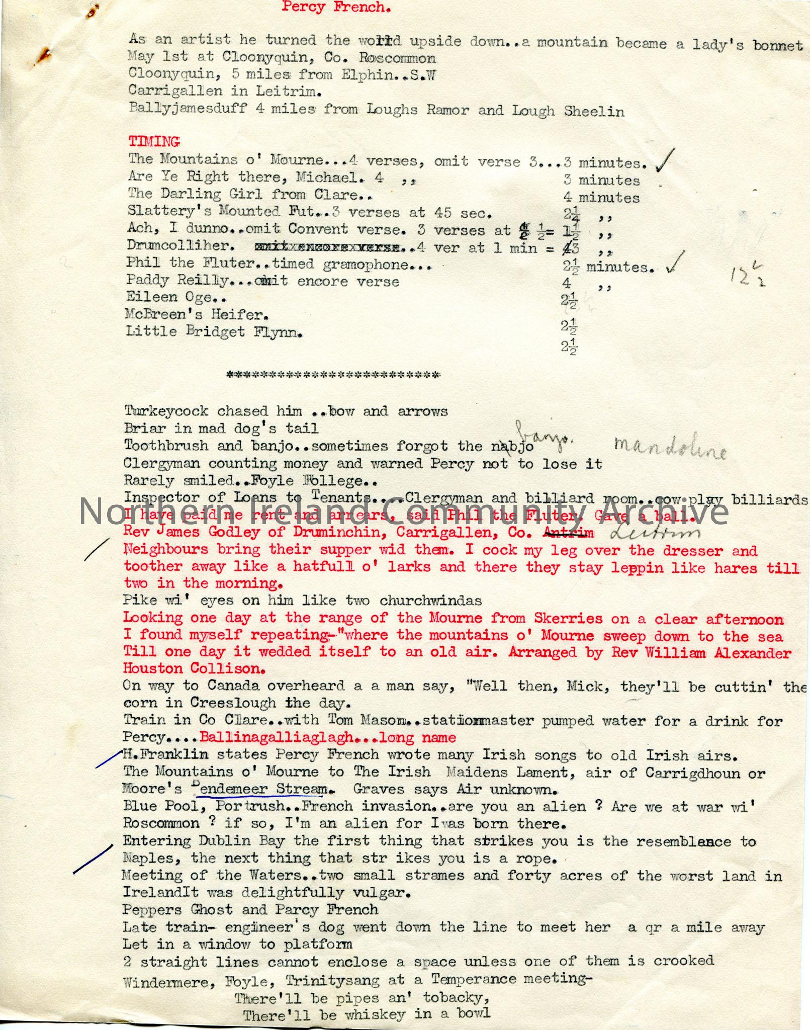 Page 1 of 2 of typed notes re Percy French for broadcast. Notes are marked in pen and pencil. Includes a list of songs and their timings. Mentions Phil the Fluter.