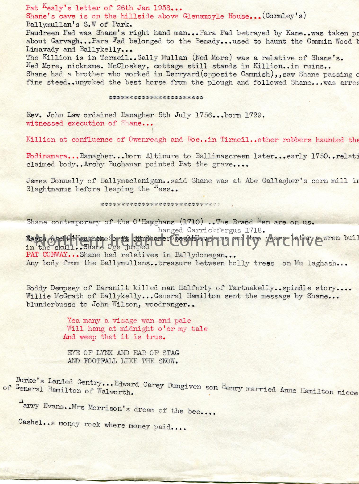 Page 1 of 2 of typed notes re Shane Crossagh. Some words are typed in red. Notes names, dates and events relating to Shane Crossagh. Mentions Paudreen Fad as Shane's right hand man; Sally Mullan (Ned More); Rev. John Law; James Donnelly of Ballymaclanigan; O'Haughan; Pat Conway; Ballydonegan; Roddy Dempsey of Barnilt; Willie McGrath of Ballykelly; blunderbusss, John Wilson; Edward Carey; Harry Evans; O'Mullan; McCurdy; Lieut General Frederick Hamilton; Major General Napper; Paddy Heaney. Includes 2 verse poem or words to song titled 'Rob Roy'. Handwritten notes in pencil on page 2 which refers to something or a person being outlawed.