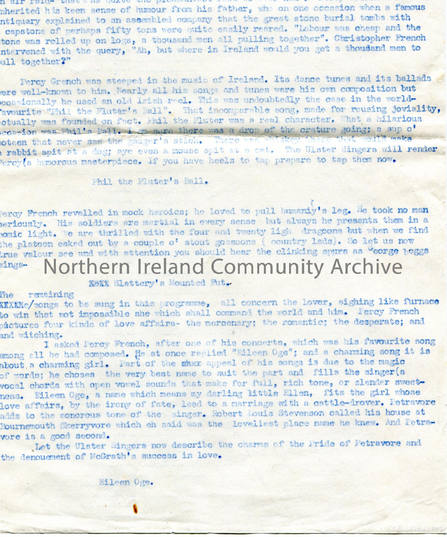 Page 1 of 2 of typed script for broadcast titled, 'Percy French Song Programme - March 4th - Forces'. Begins with information on his life and career before discussion of his songs - 'Phil the Fluter's Ball', 'Slattery's Mounted Fut', 'Mileen Oge', 'The Night that Miss Cooney Eloped', 'Little Bridget Flynn' and 'McBreen's Heifer'.