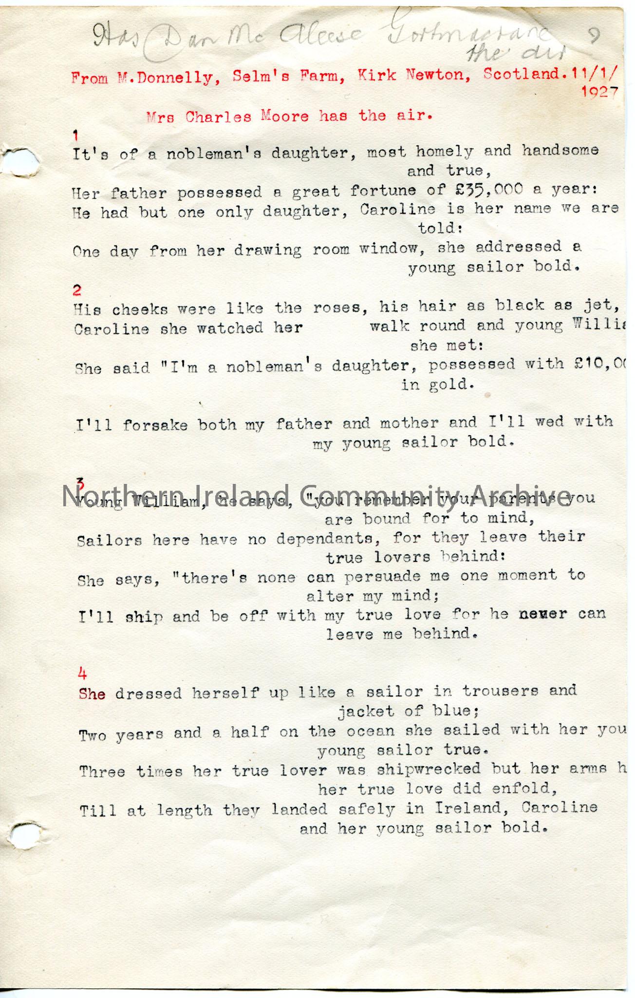 Page 1 of 2 of typed song, not titled. States that the song is from M.Donnelly, Selm's Farm, Kirk Newton, Scotland. 11th January, 1927. Mrs Charles Moore has the air. 'Has Dan McAleese Gortmactane the air?' handwritten in pencil at top of page. On the second page after the last verse it states, 'This song was sung to me by my father and his father learnt it from his father'.