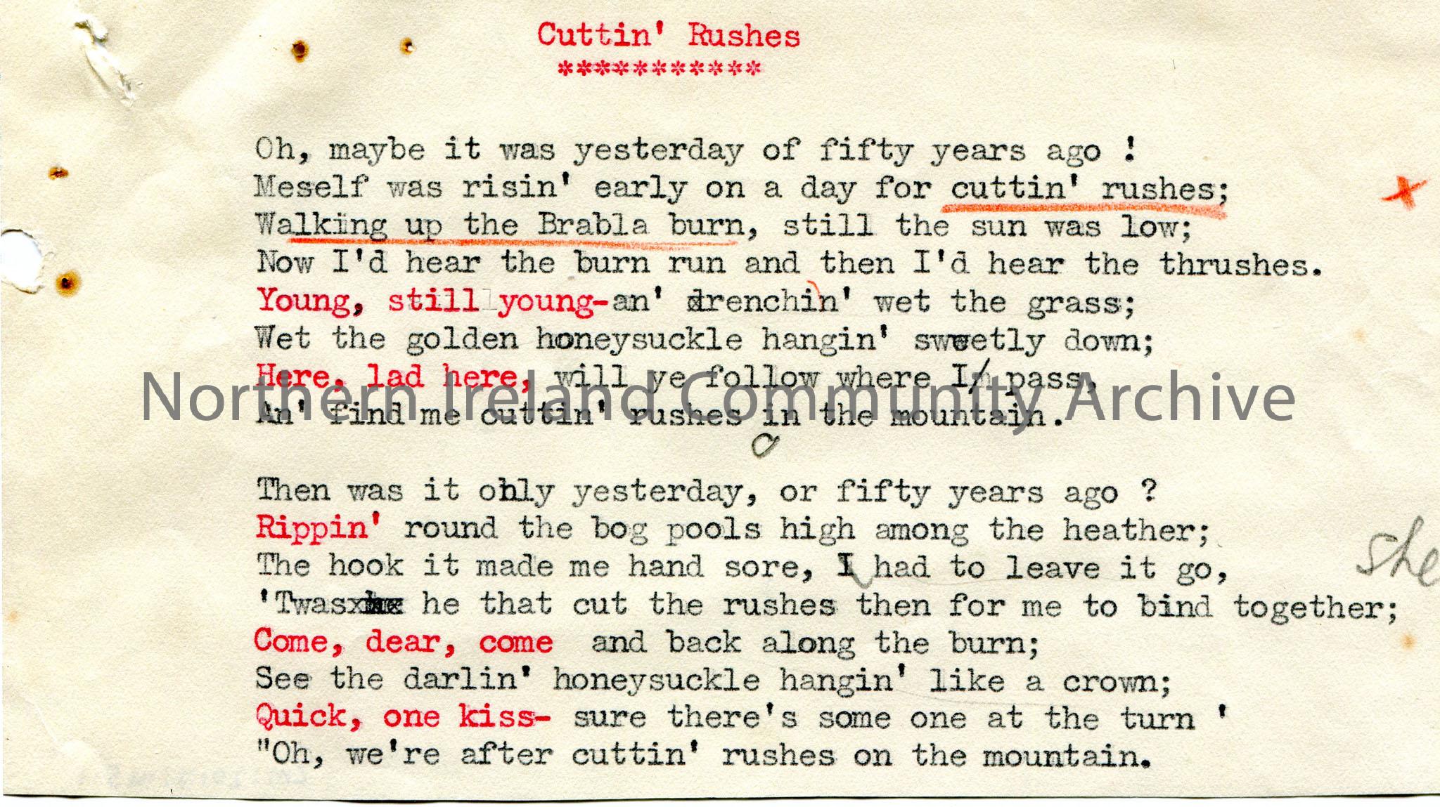 Page 1 of 2 of typed song titled, ‘Cuttin’ Rushes’ re a walk at Brabla burn and the song of the thrushes.