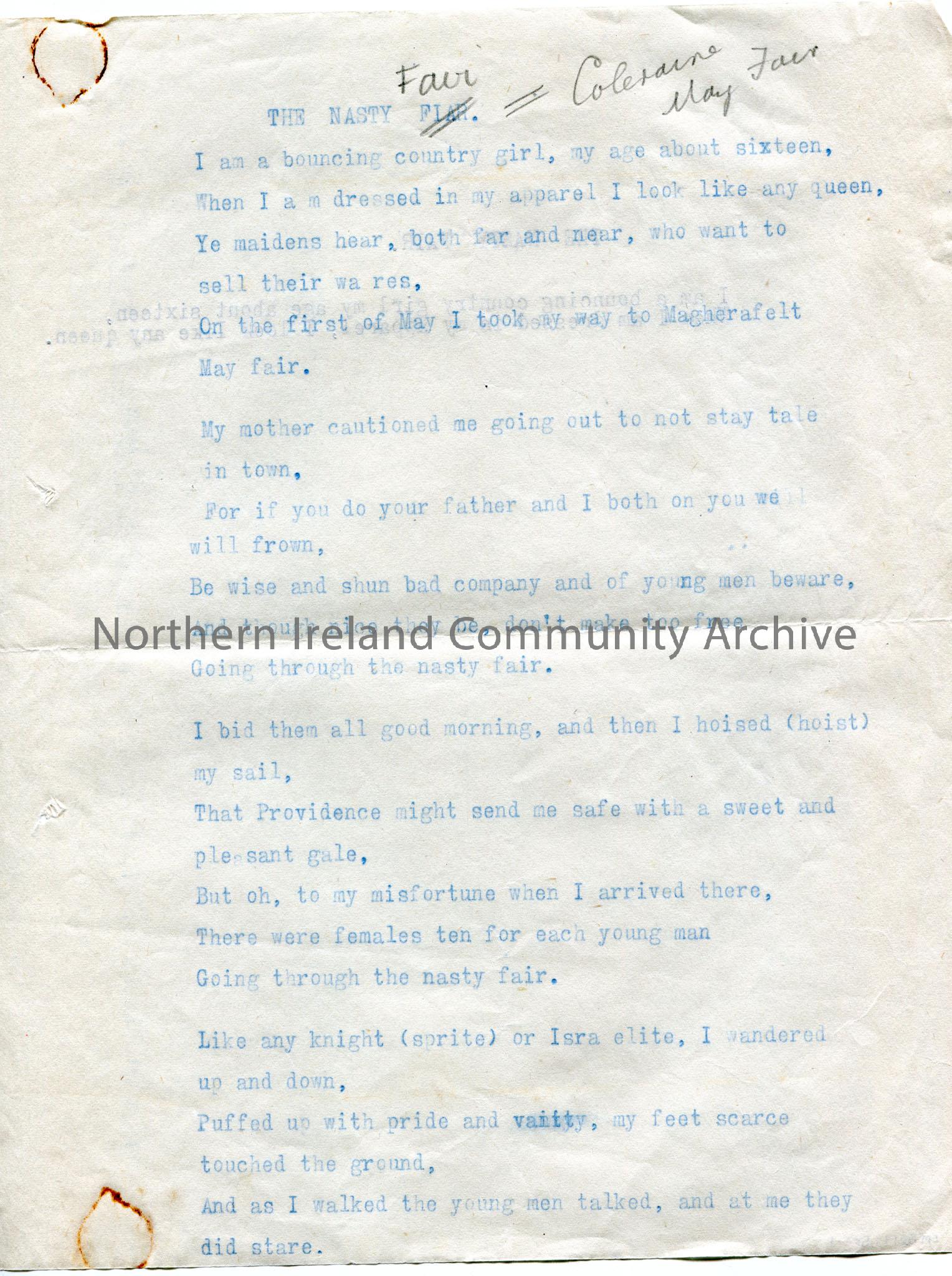 Page 1 of 2 of typed song titled, ‘The Nasty Fair’. ‘Coleraine May Fair’ is handwritten in pencil at top of page. Song refers to the Magherafelt May f…