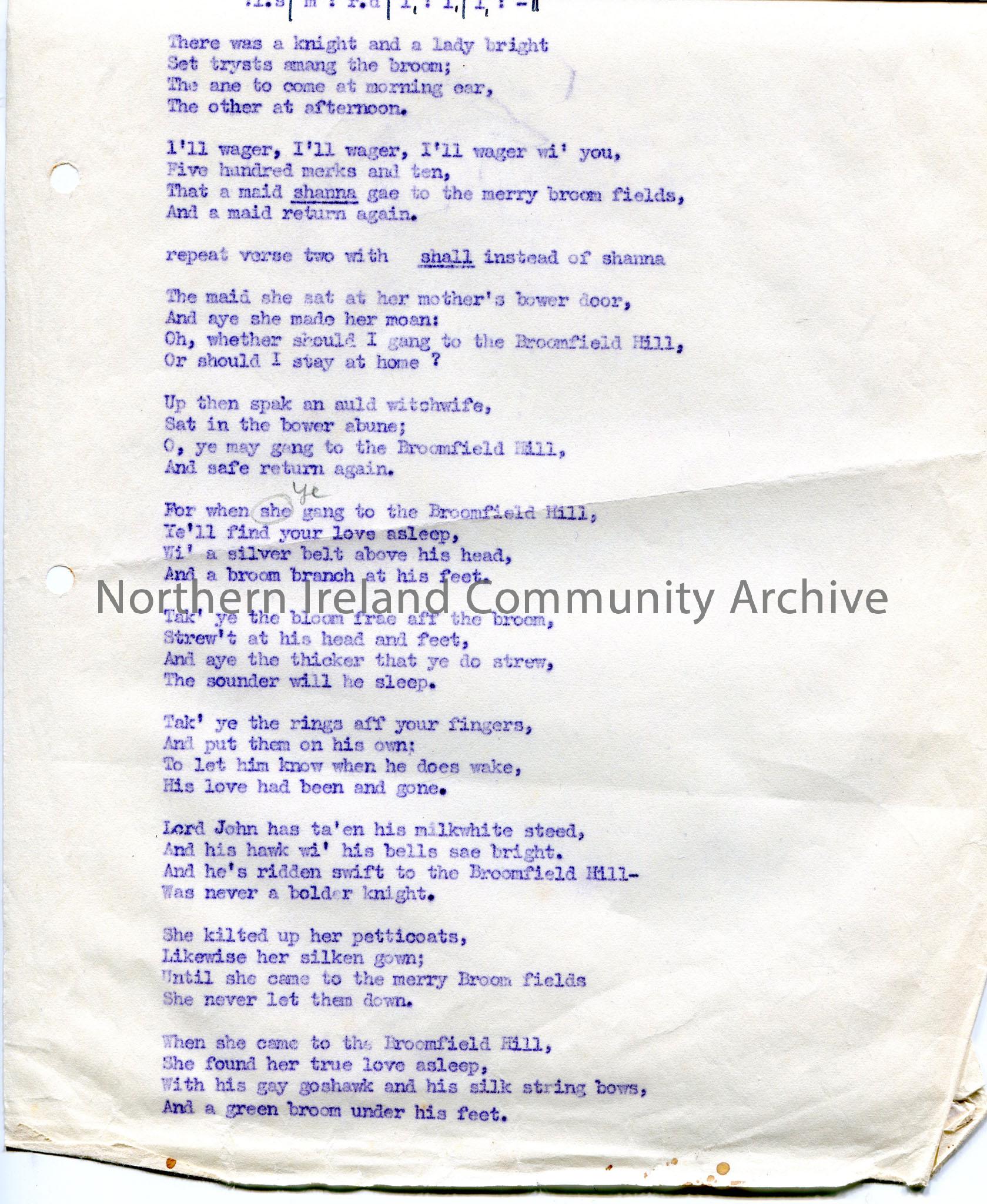 Page 1 of 2 of typed tonic sol-fa notation and words to song titled, ‘No. 135 – The Broomfield Hill’. The air and part of the ballad were from John Mc… – scan279b