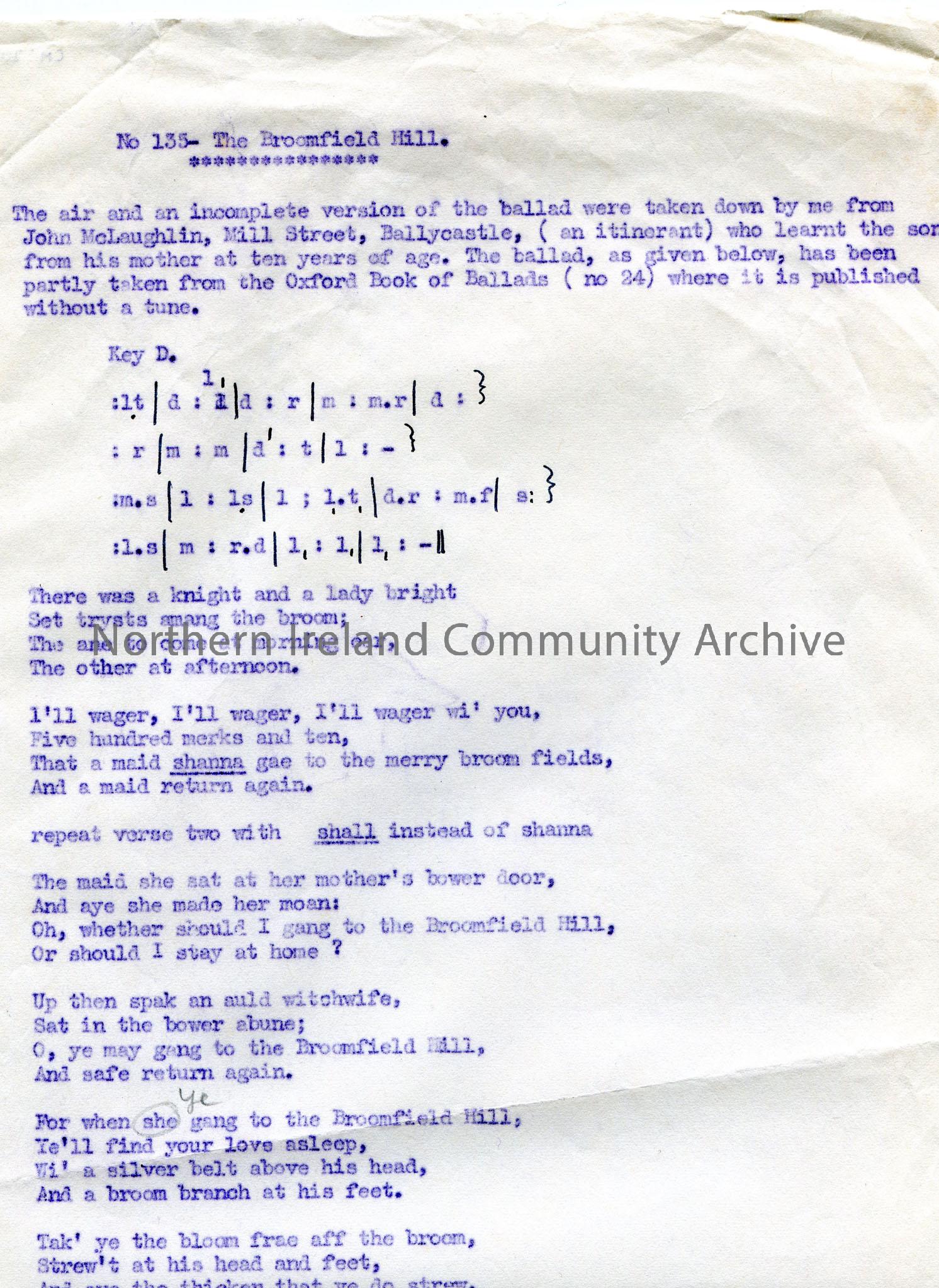 Page 1 of 2 of typed tonic sol-fa notation and words to song titled, 'No. 135 - The Broomfield Hill'. The air and part of the ballad were from John McLaughlin, Ballycastle and the rest was taken from the Oxford Book of Ballads.