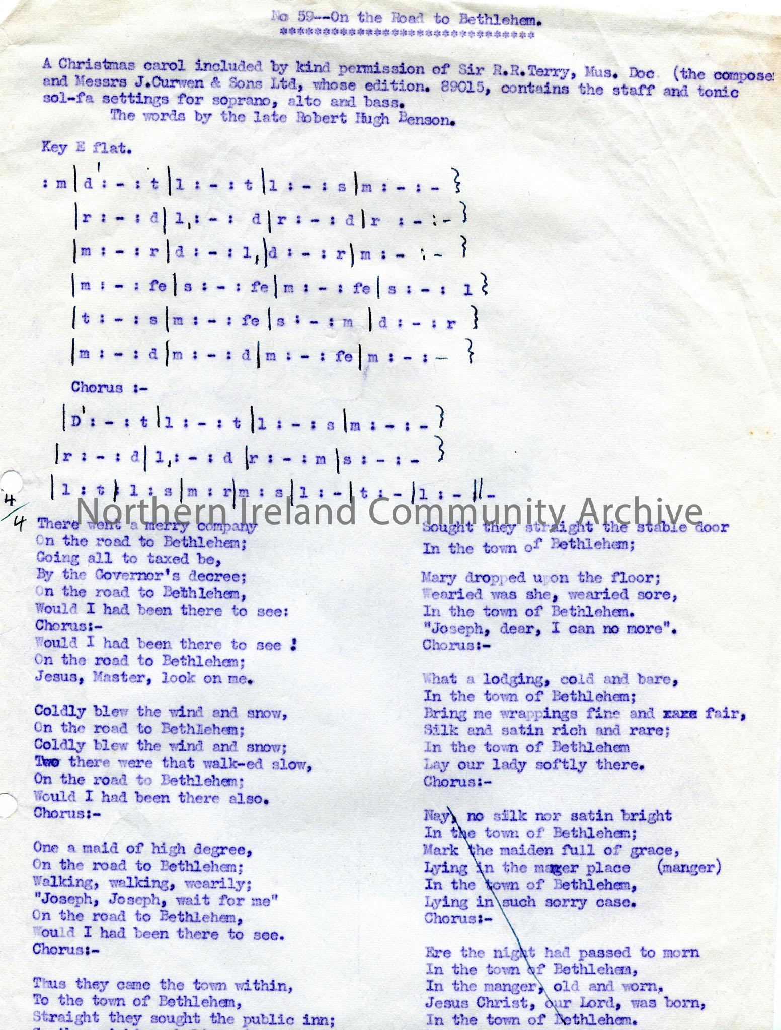 Page 1 of 2 of typed tonic sol-fa notation and words to song titled, ‘No. 59 – On the Road to Bethlehem’.