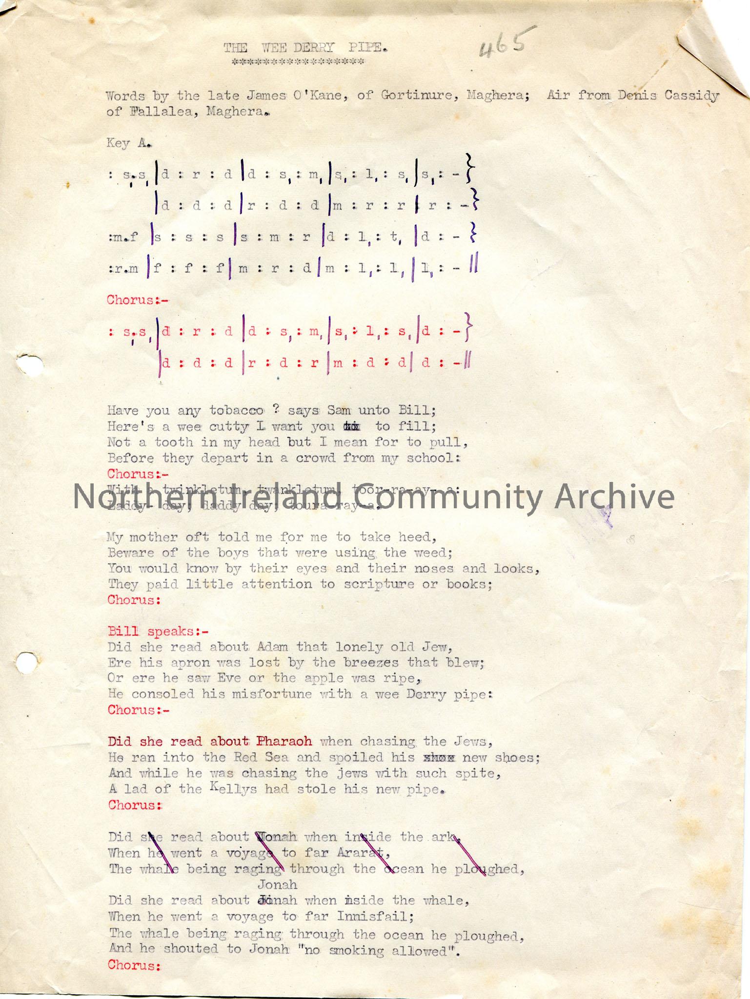 Page 1 of 2 of typed tonic sol-fa notation and words to song titled, 'The Wee Derry Pipe'. Words by James O'Kane, Gortinure, Maghera. Air from Denis Cassidy, Fallalea, Maghera.