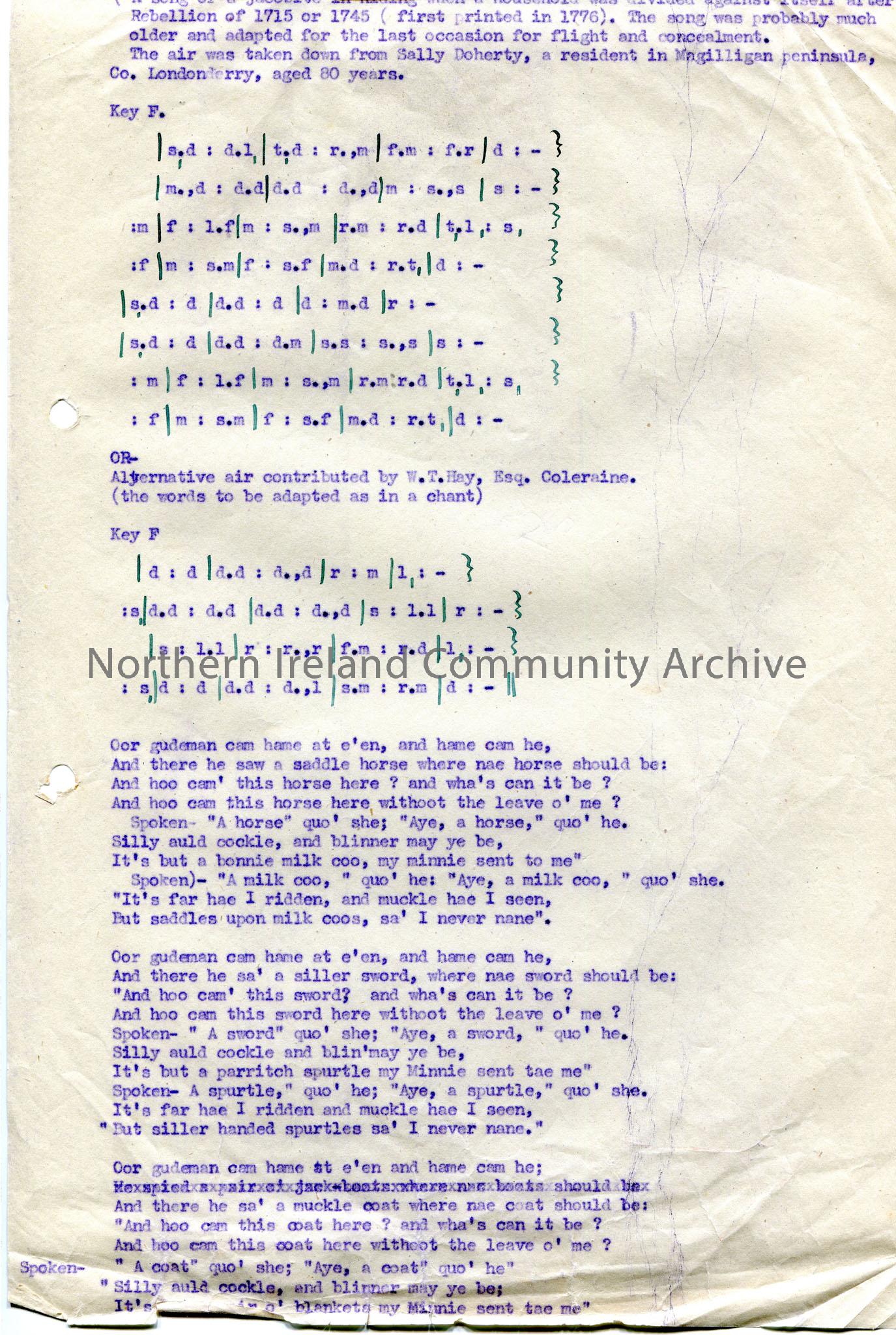 Page 1 of 2 of typed tonic sol-fa notations and words to song titled, 'No. 21 - An Auld Sang In Braid Scots. The Blin' Auld Man: or The Covered Cavalier'. The first tonic sol-fa notation was taken from Sally Doherty, Magilligan and the second from W.T.Hay, Coleraine.