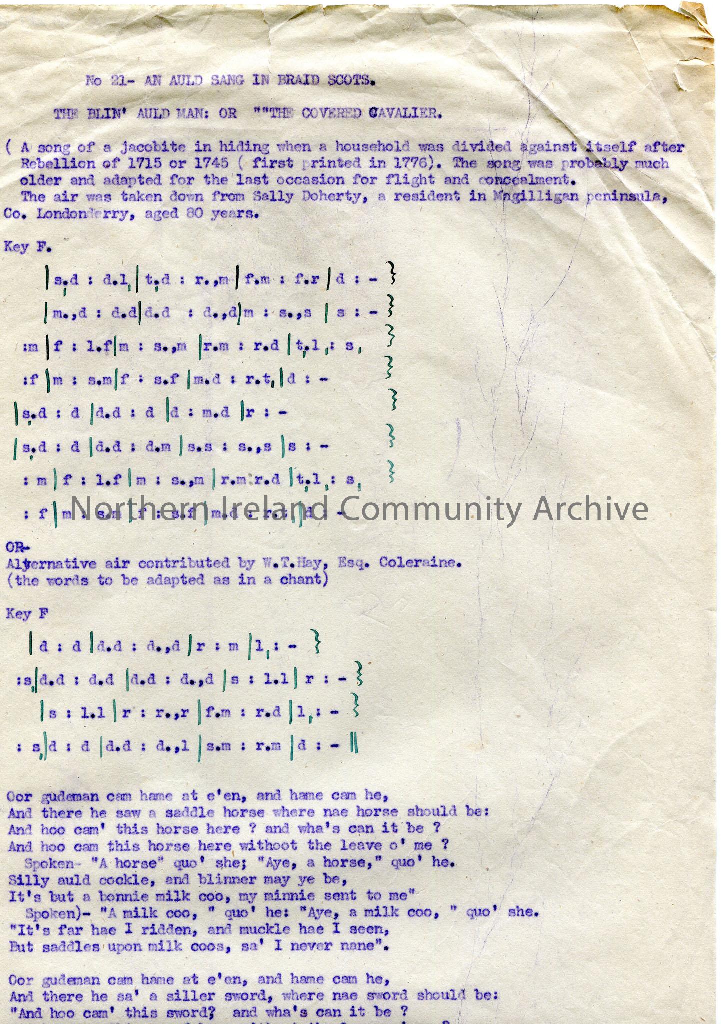 Page 1 of 2 of typed tonic sol-fa notations and words to song titled, 'No. 21 - An Auld Sang In Braid Scots. The Blin' Auld Man: or The Covered Cavalier'. The first tonic sol-fa notation was taken from Sally Doherty, Magilligan and the second from W.T.Hay, Coleraine.