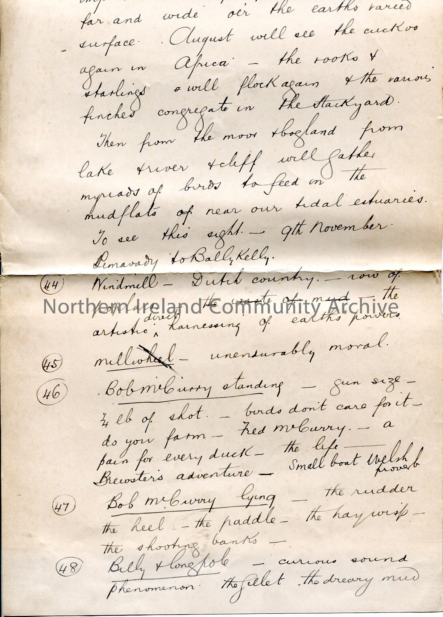 Page 1 of 2. Page as part of a lecture [other pages missing]. Handwritten lecture re birds. Mentions Bob McCurry and the salmon fisheries, Cranagh, Robbs Glen and Lyles Lane, all of Coleraine. Points numbered as if for slides 44-54.
