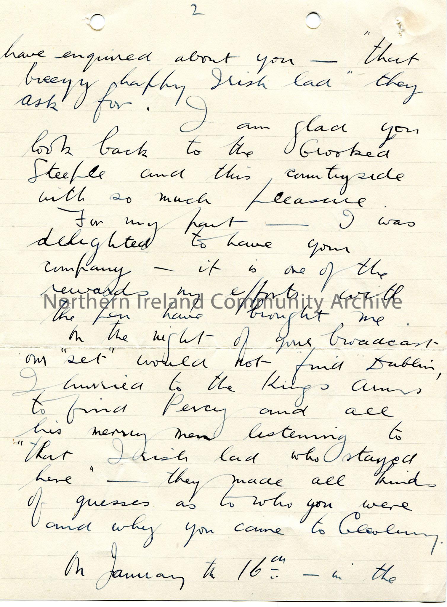 Page 1 of 2 pages of handwritten letter, double sided, to Sam Henry. Thanks Sam for sending letter and books. Sent 'Tales of the Antrim Sea board' to Father Rope and is waiting on reply. Refers to Sam's 'Antrim Keepsake' as a reminder of meeting with Sam. Writes that many people have enquired about Sam. He was glad Sam looked back at his work the 'Crooked Steeple' with pleasure. Writes about a chocolate and sweet talk to happen on 16th January. Speaks of an upcoming talk of his own on Shropshire place names and life around the Crooked Steeple. Enclosed two or three articles to remind Sam of Shropshire. Sends his luck and Christmas wishes.