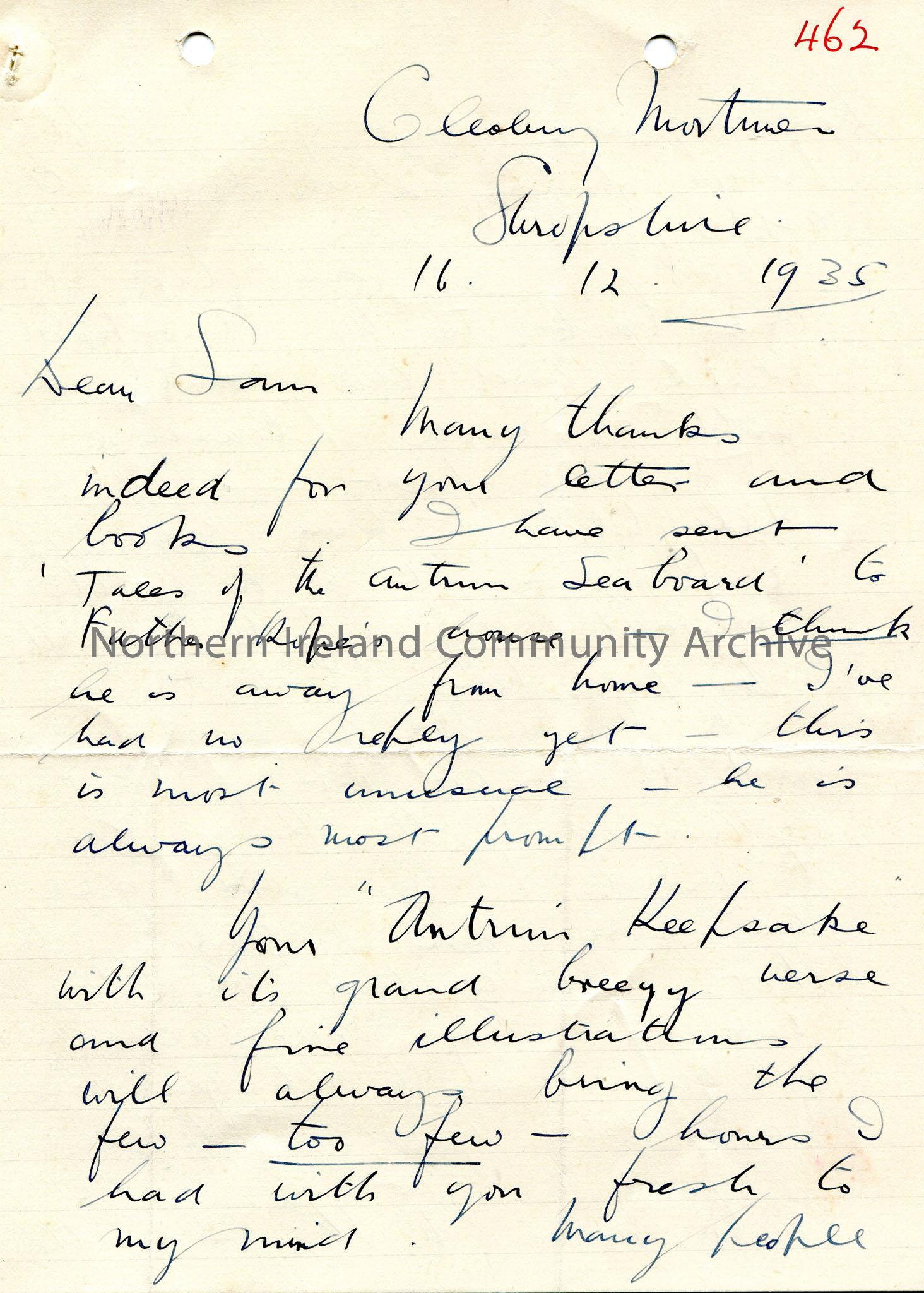 Page 1 of 2 pages of handwritten letter, double sided, to Sam Henry. Thanks Sam for sending letter and books. Sent ‘Tales of the Antrim Sea board’ to …
