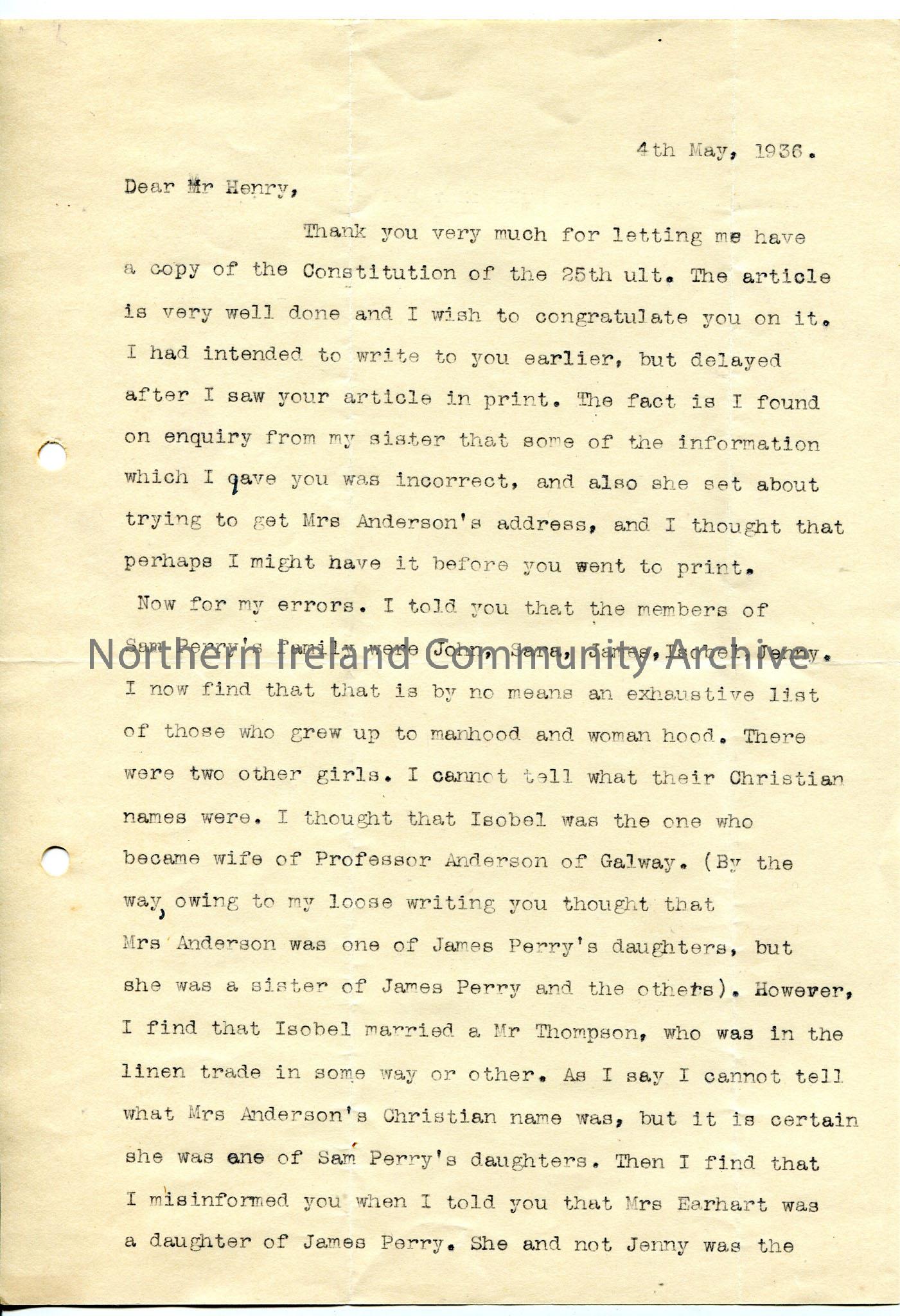 Page 1 of 2 pages of typed letter re Perry family history - corrections to information given in earlier letter