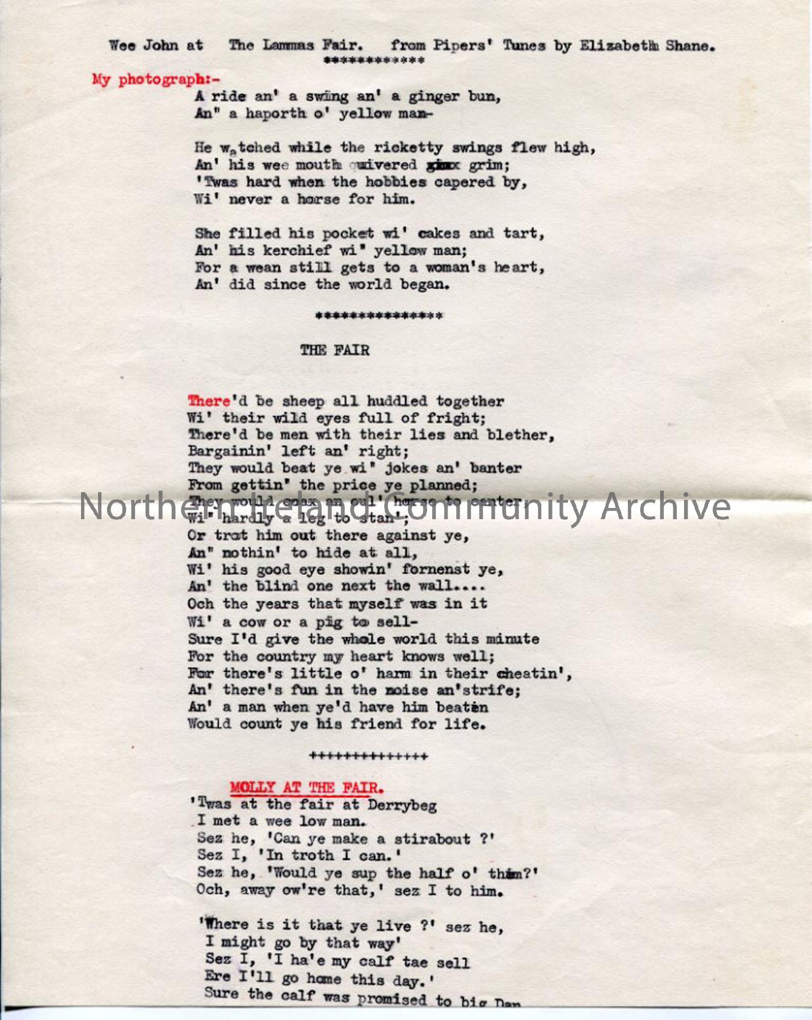1 of 2 typed pages with words to several poems about fairs - 'Wee John at the Lammas Fair';'The Fair'; 'Molly at the Fair'; 'Fresh Dulse for the Fair' - some comical.