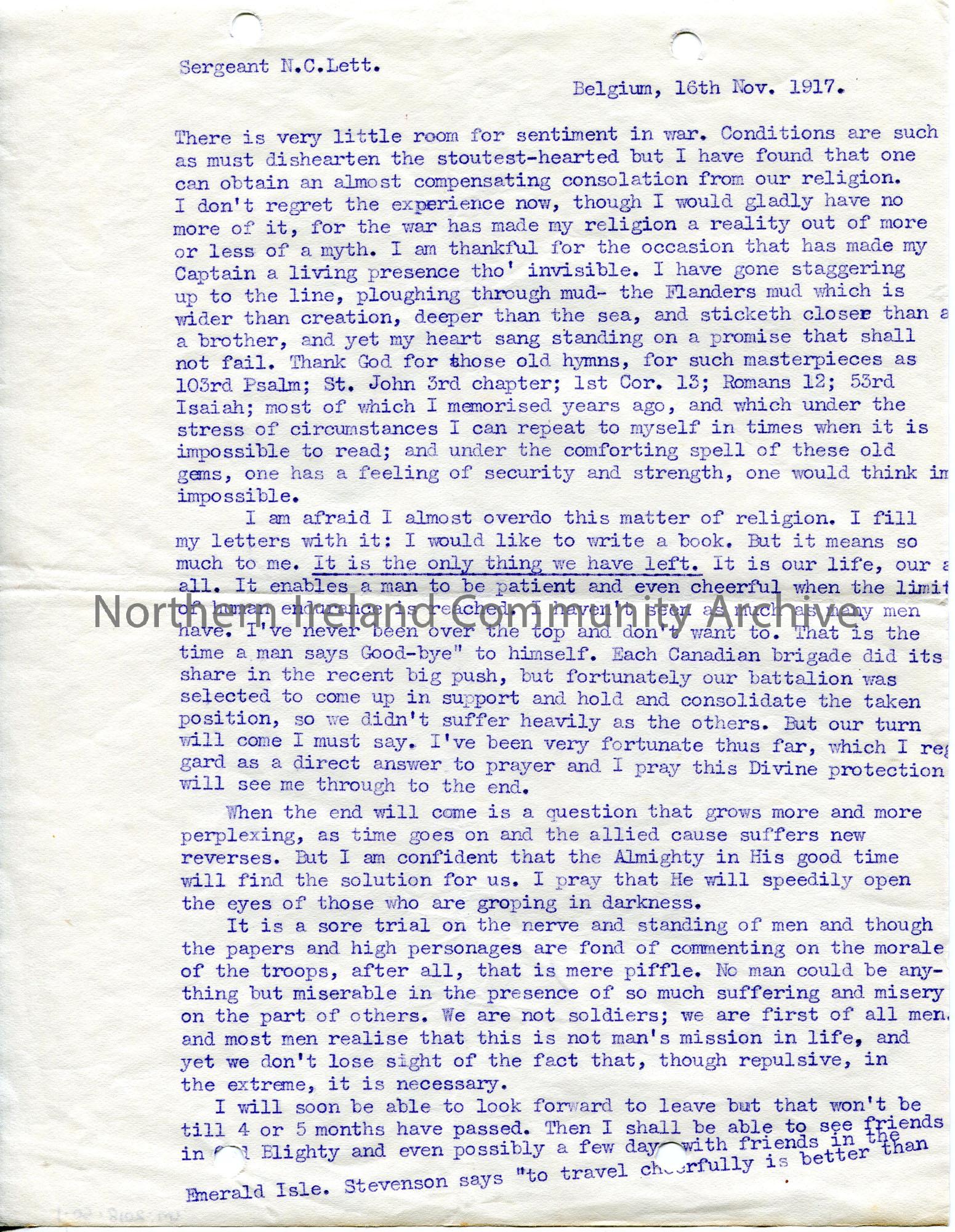 Page 1 of 2. Transcribed and typed letter, presumably to Sam Henry. Sergeant N C Lett is writing from a tent in Belgium about his experiences of fighting in the First World War. Writing re the strain of war and experience of fighting in Flanders. Looks forward to spending leave in he 'Emerald Isle'. Mentions Coleraine.