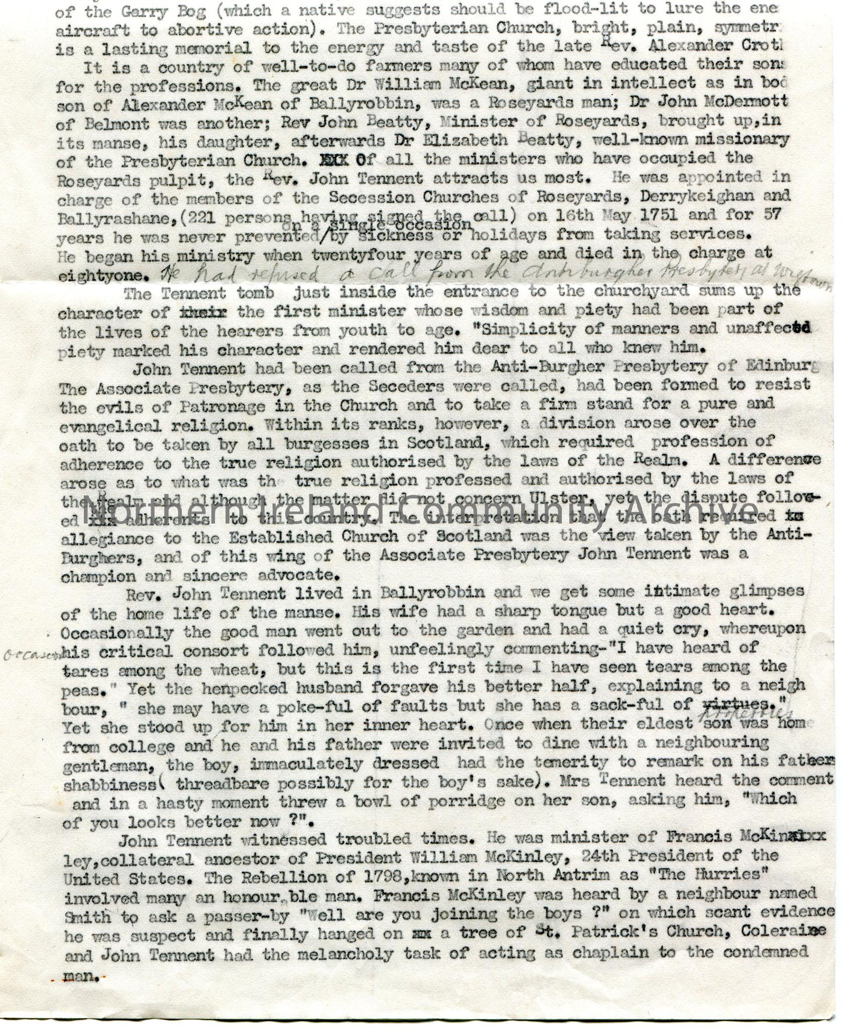 Page 1 of 2. Typed document by Sam Henry, Sandelford, Coleraine, titled, 'John Tennent of Roseyards. The Origin of the Belfast Bank'. John Tennent was Reverend of Roseyards Presbyterian Church from 16th May 1751. He was originally from Ballyrobbin. Details his life and career. Reference to his sons William and Robert. William went on to form the Commercial Bank which became known as Tennent and Co's Bank and later Belfast Banking Co.