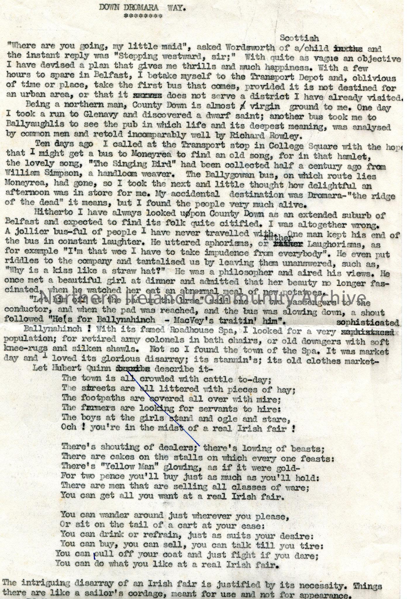 Page 1 of 2. Typed document titled, “Down Dromara Way”. Notes re taking a bus through County Down to Dromara. Poem or words to song by Hubert Quinn de…