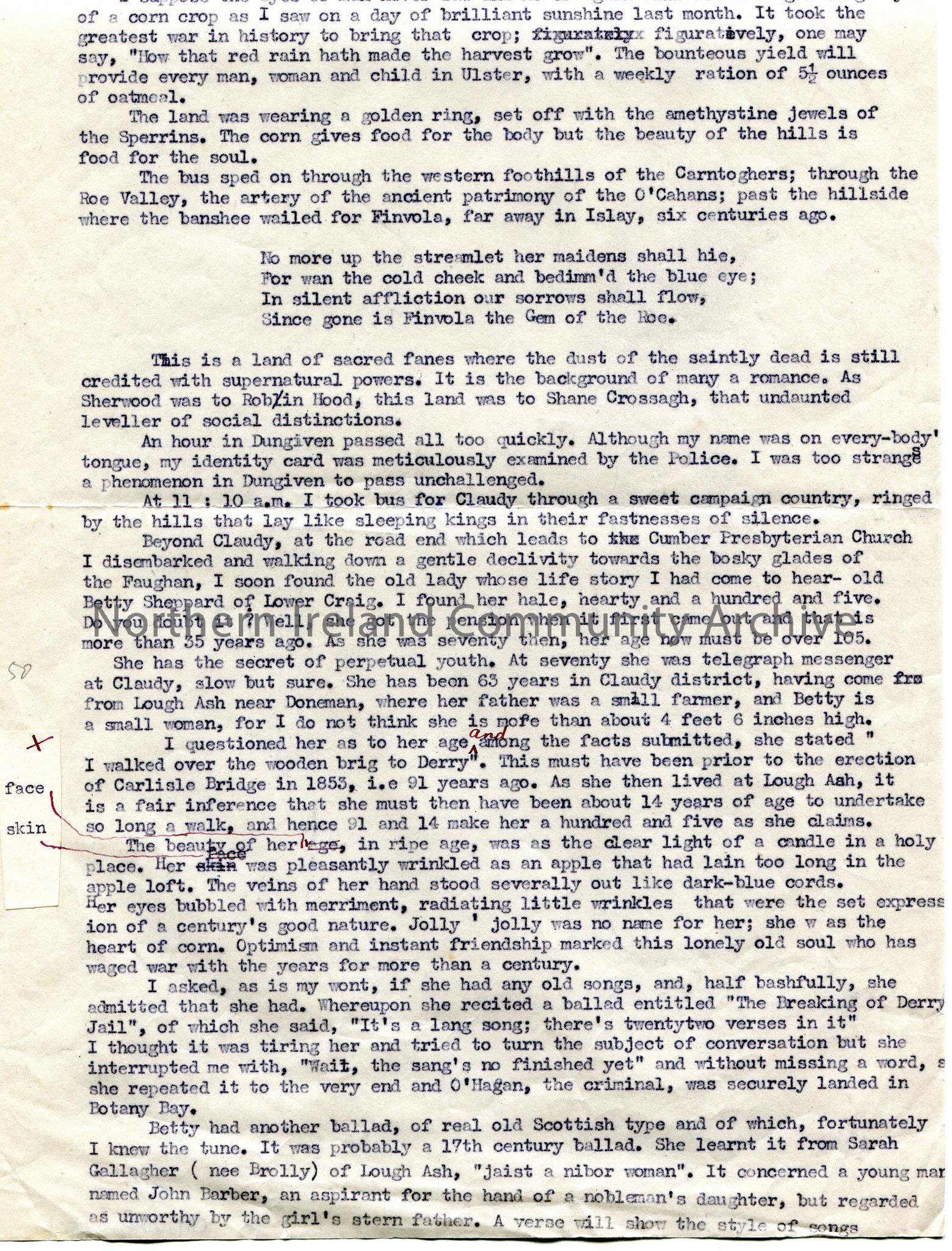 Page 1 of 2. Typed document titled, "I Seek a Centenarian", by Sam Henry. Dated 30th September, 1944. Re a lady called Betty Sheppard of Lower Craig, Faughan near Claudy, aged 105 years. Song titled, "The Garden where the Praties Grow". End with a verse of poem or words to song re Betty Sheppard.