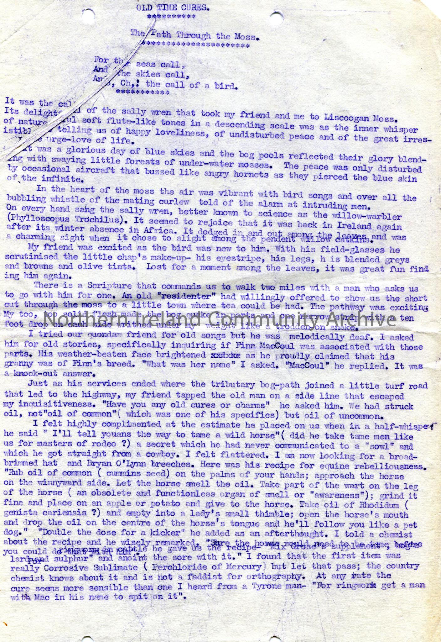 Page 1 of 2 typed document titled, 'Old Time Cures. The Path Through the Moss'. Re a trip with a friend to Liscoogan Moss. Describes various birds in their environment. Wants to know of any stories re Finn MacCoul. Met an old man who told them of various cures such as taming a horse, cures for toothache, sprains, whooping cough, witchcraft and other cures. 'The Rasharkin Charmer' handwritten on back of second page.