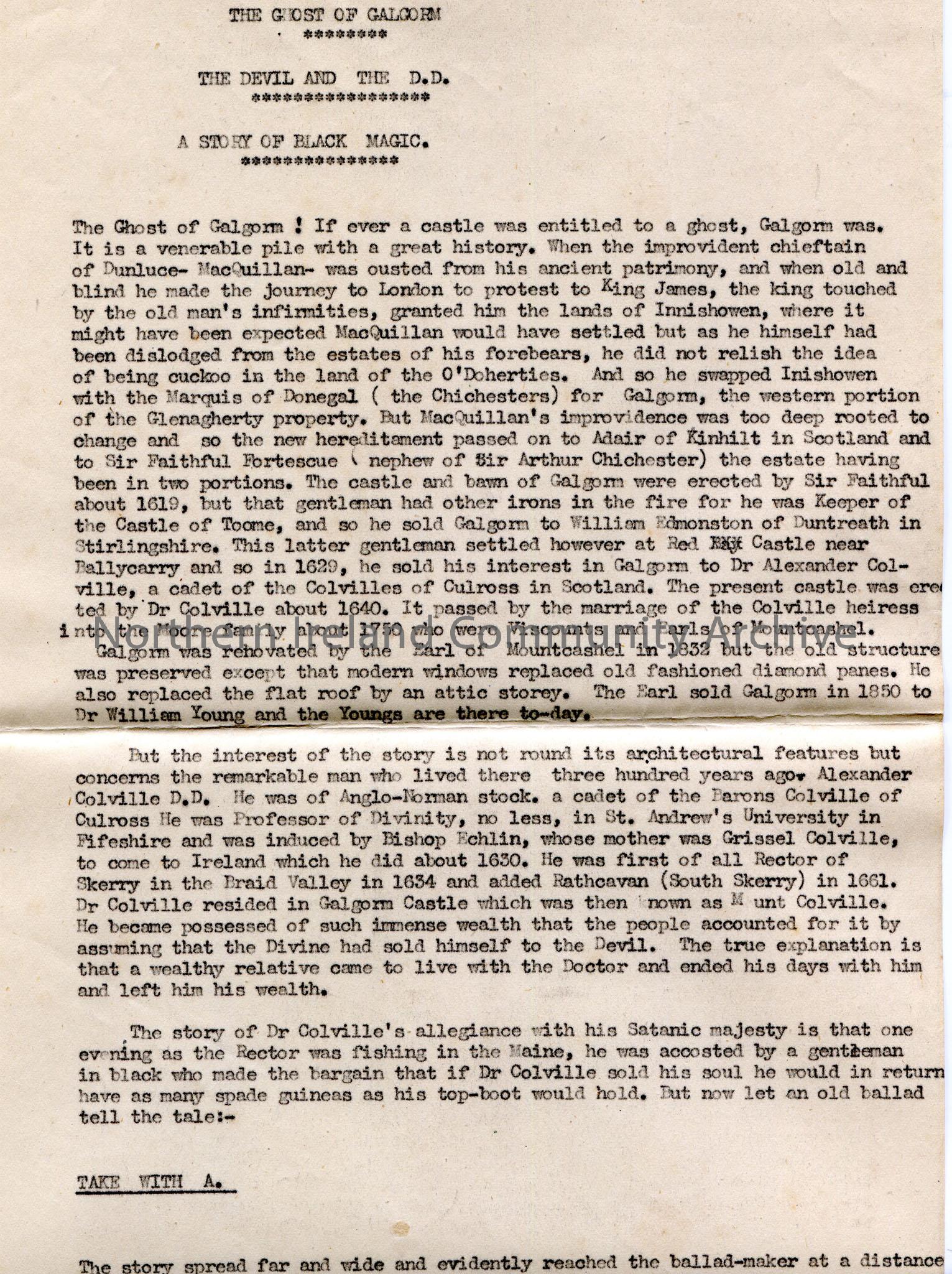 Page 1 of 2 typed document titled, ‘The Ghost of Galgorm. The Devil and the D.D. A Story of Black Magic’. Re Dr Colville, who built Galgorm Castle in …