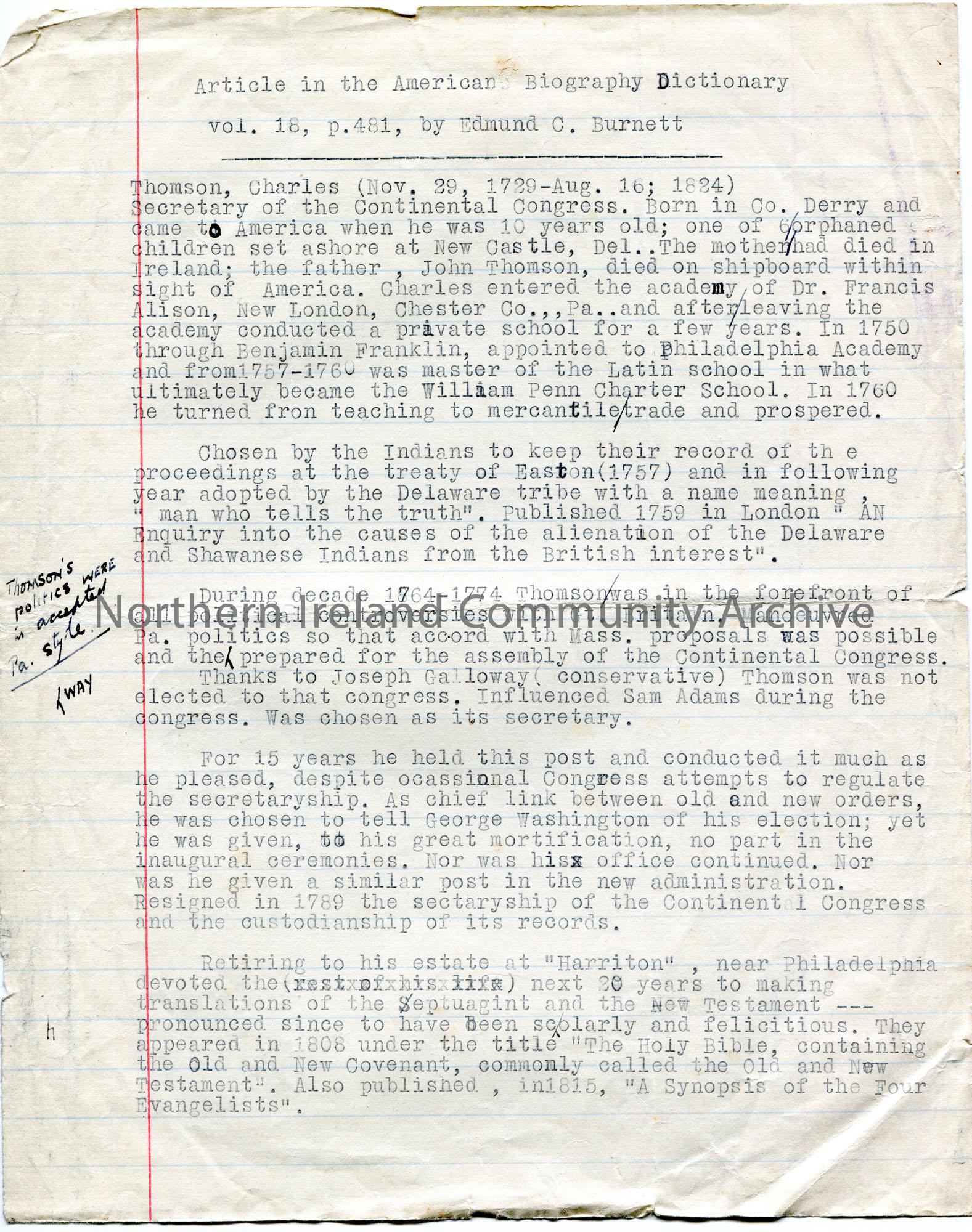 Page 1 of 2. Typed extract on lined paper from ‘Dictionary of American Biography’. Vol 18, p.481 by Edmund C. Burnett. Article re Charles Thomson. Sig…