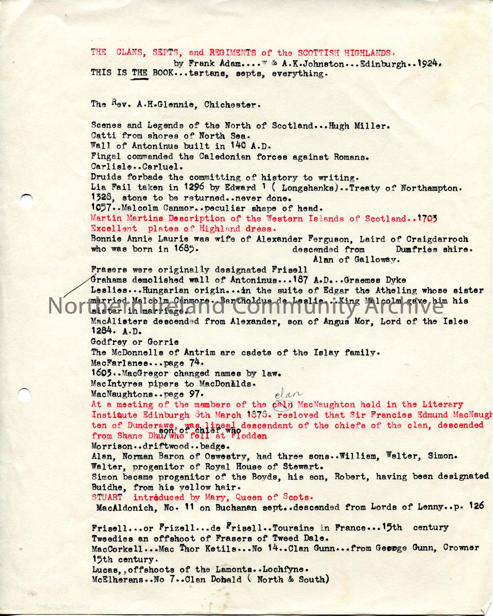 Page 1 of 2. Typed extracts from book titled, ‘The Clans, Septs and Regiments of the Scottish Highlands’ by Frank Adam, 1924.