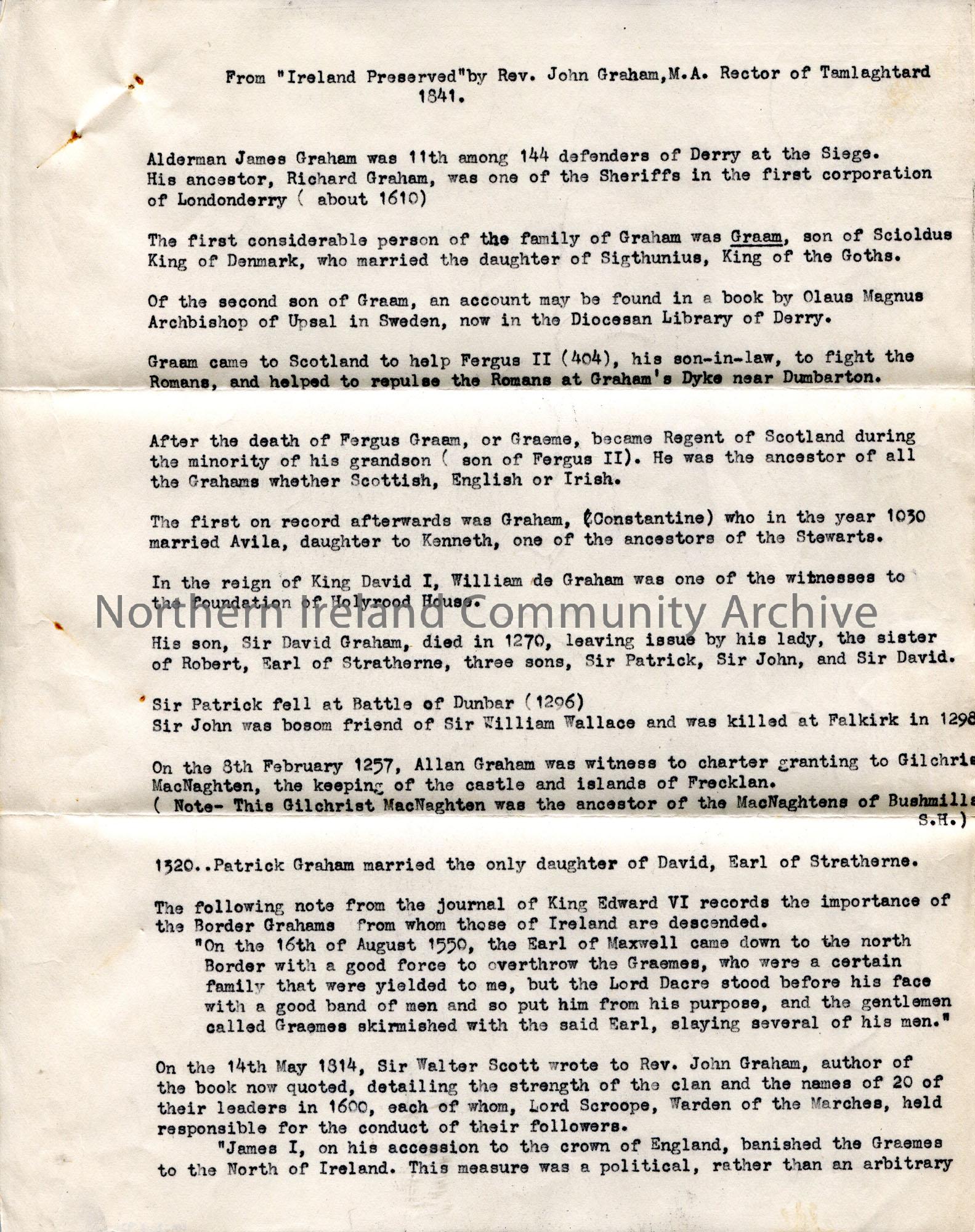 Page 1 of 2. Typed extracts from "Ireland Preserved" by Rev. John Graham, M. A. Rector of Tamlaghtard 1841.