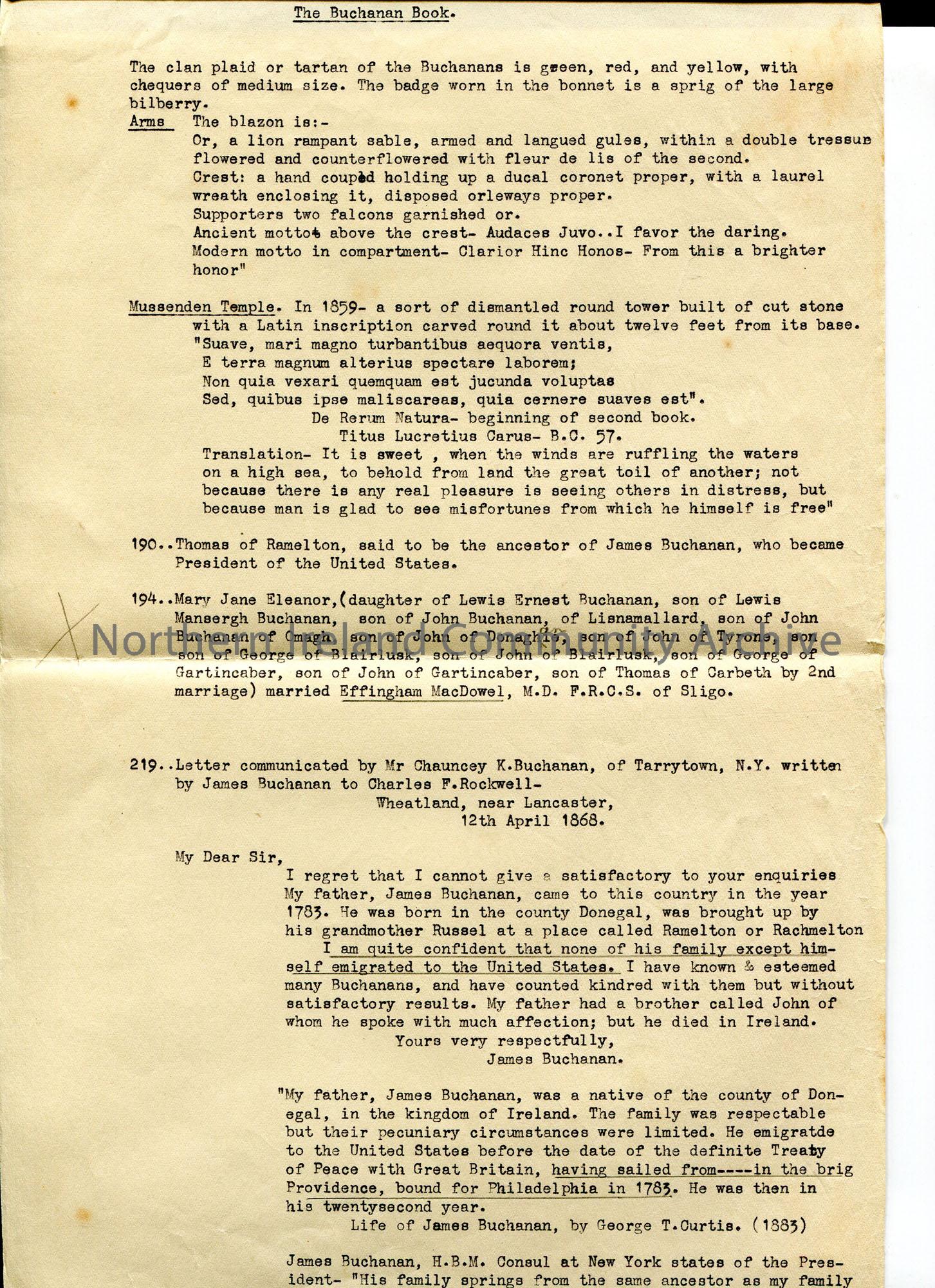 Page 1 of 2. Typed extracts from ‘The Buchanan Book’. The surname Foster is handwritten in pencil and circled on page 2.