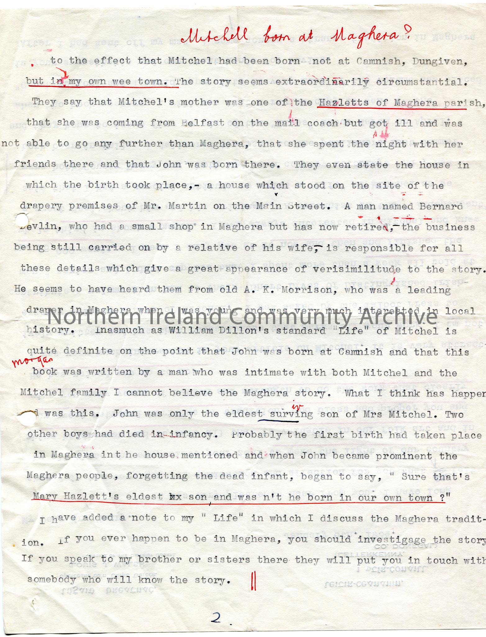 Page 1 of 2. Typed letter from Louis Walsh to Sam Henry. He describes his admiration for Sam and his work. He refers to the writing of his book 'Mitchel' and whether Mitchel was born in Maghera as a son of one of the Hazletts of Maghera parish. Referred to an article about Banagher Glen written by Sam in the Constitution. Sending Sam his novel "The Next Time" not well known in Ireland.