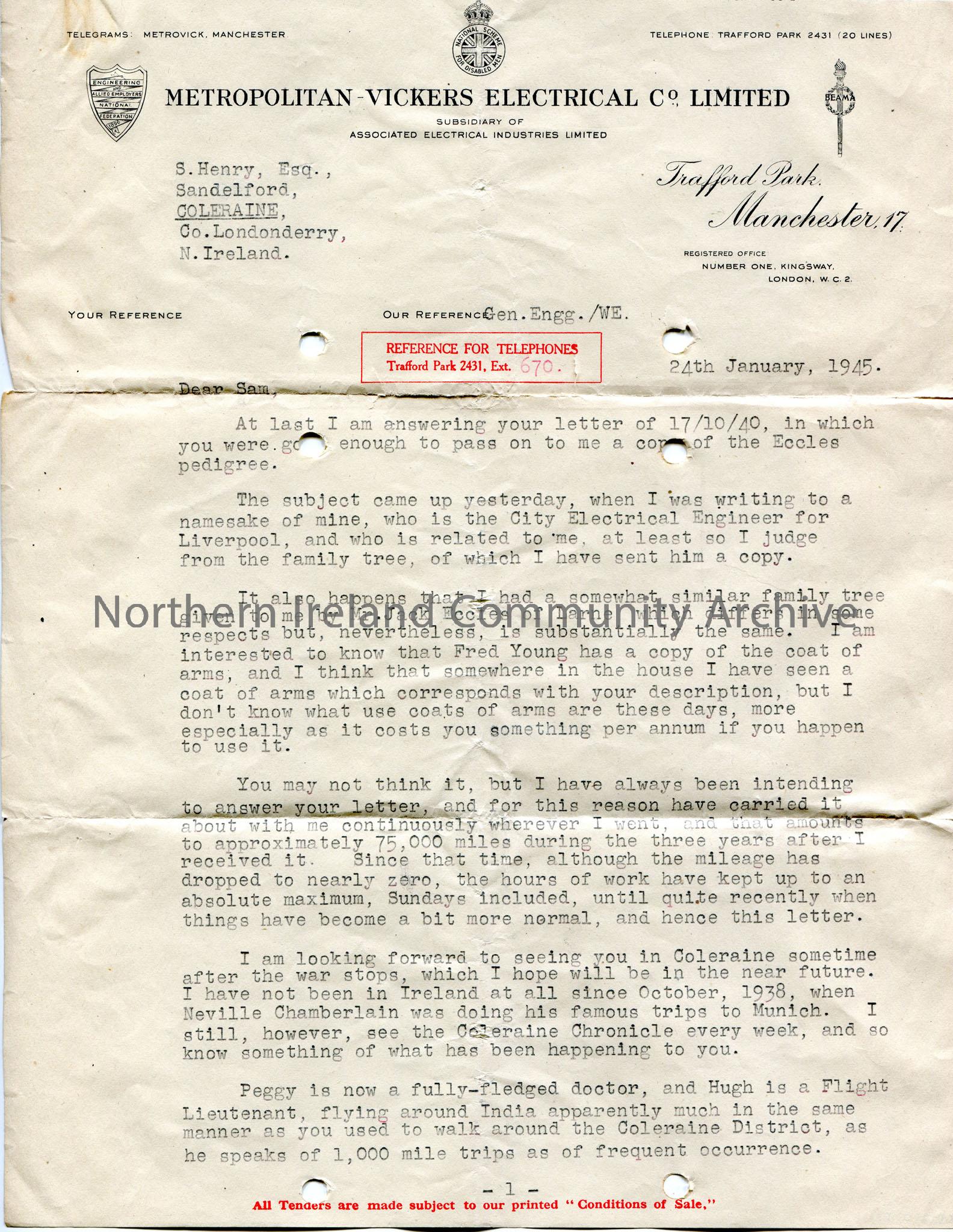 Page 1 of 2. Typed letter on headed paper to Sam Henry, Sandelford, Coleraine, Co. Londonderry, N. Ireland. Sam had researched genealogical information re Eccles. Replying to Sam's letter of 17th October 1940. He was given a similar family tree by Mr Jack Eccles of Larne. Mentions that Fred Young has a copy of the coat of arms. Comments on the late reply to Sam's letter. Hopes to get back to Coleraine after the war [World War II] is over. Writes that Peggy is now a doctor and Hugh is a Flight Lieutenant, currently in India, both have Irish spouses.