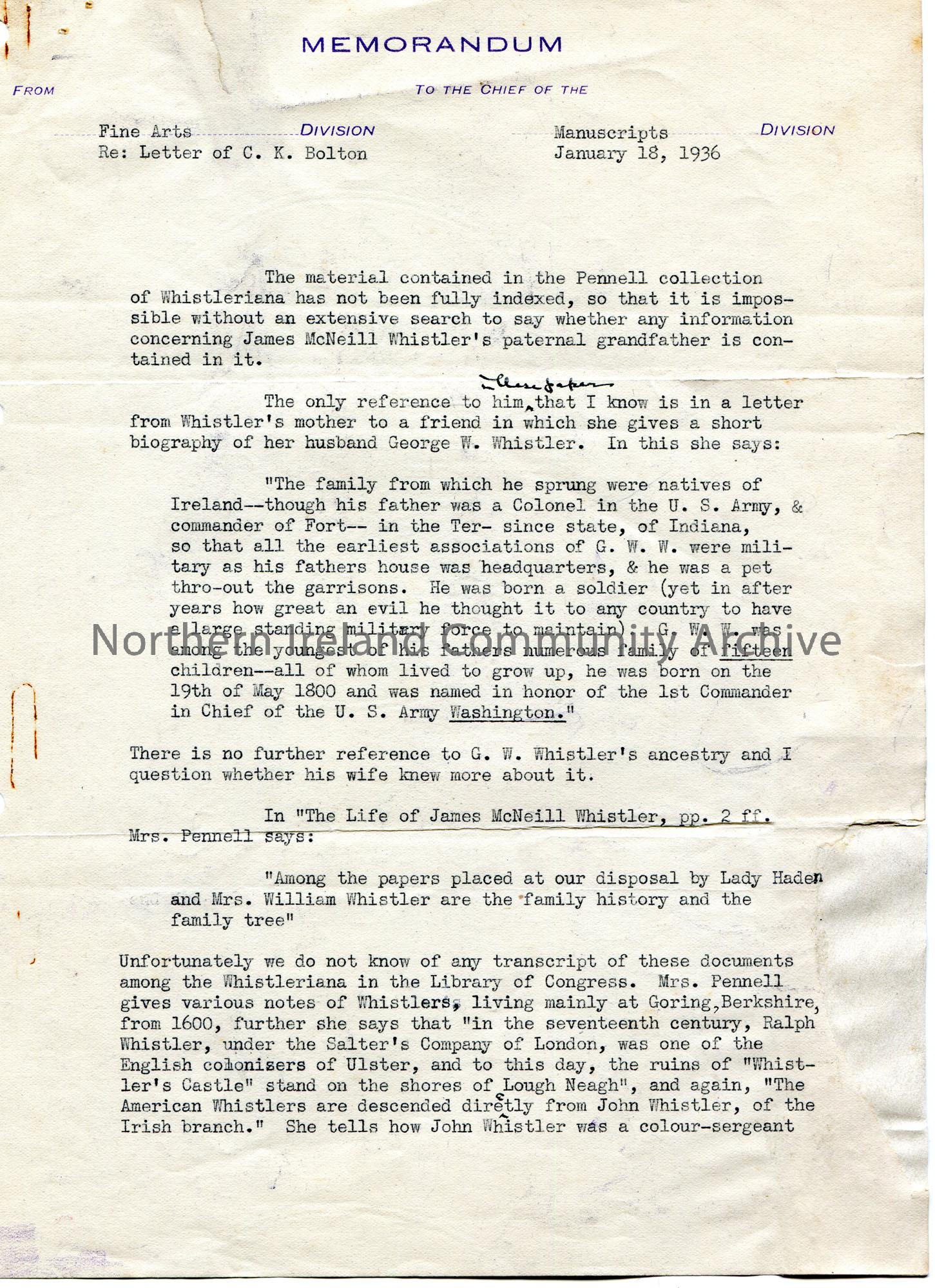 Page 1 of 2. Typed letter or memorandum to the Chief of the Manuscripts Division. Writing re Whistler genealogy. References the letter of C.K. Bolton.