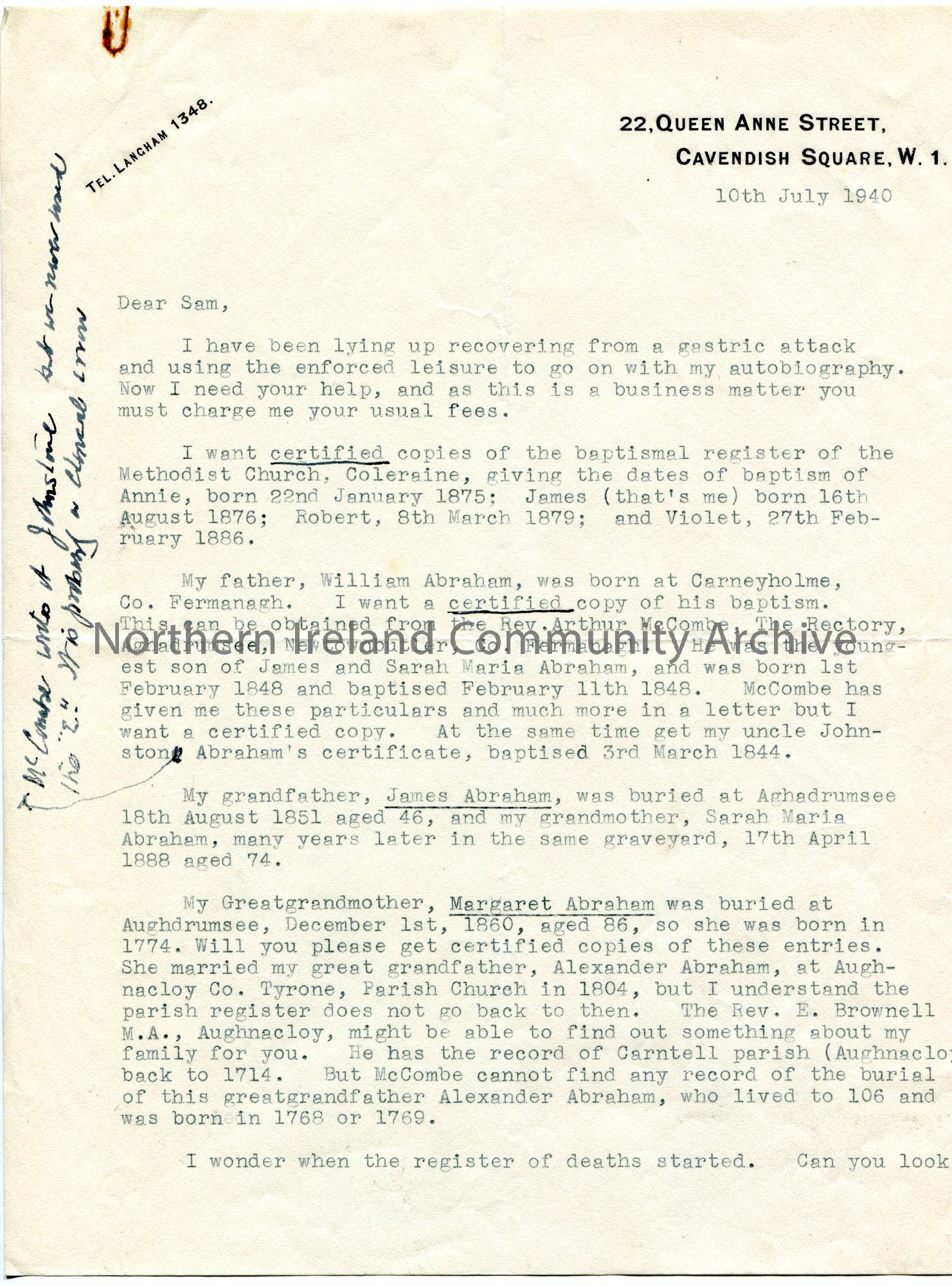 Page 1 of 2. Typed letter to Sam Henry. Asking for Sam's help with genealogical research for his autobiography. Handwritten note at end of letter of his concerns surrounding increased anti-Semitism in England. He writes, 'I hate anyone thinking there is any Jewish blood in me'. Handwritten notes in pencil by Sam Henry re family of Abraham.