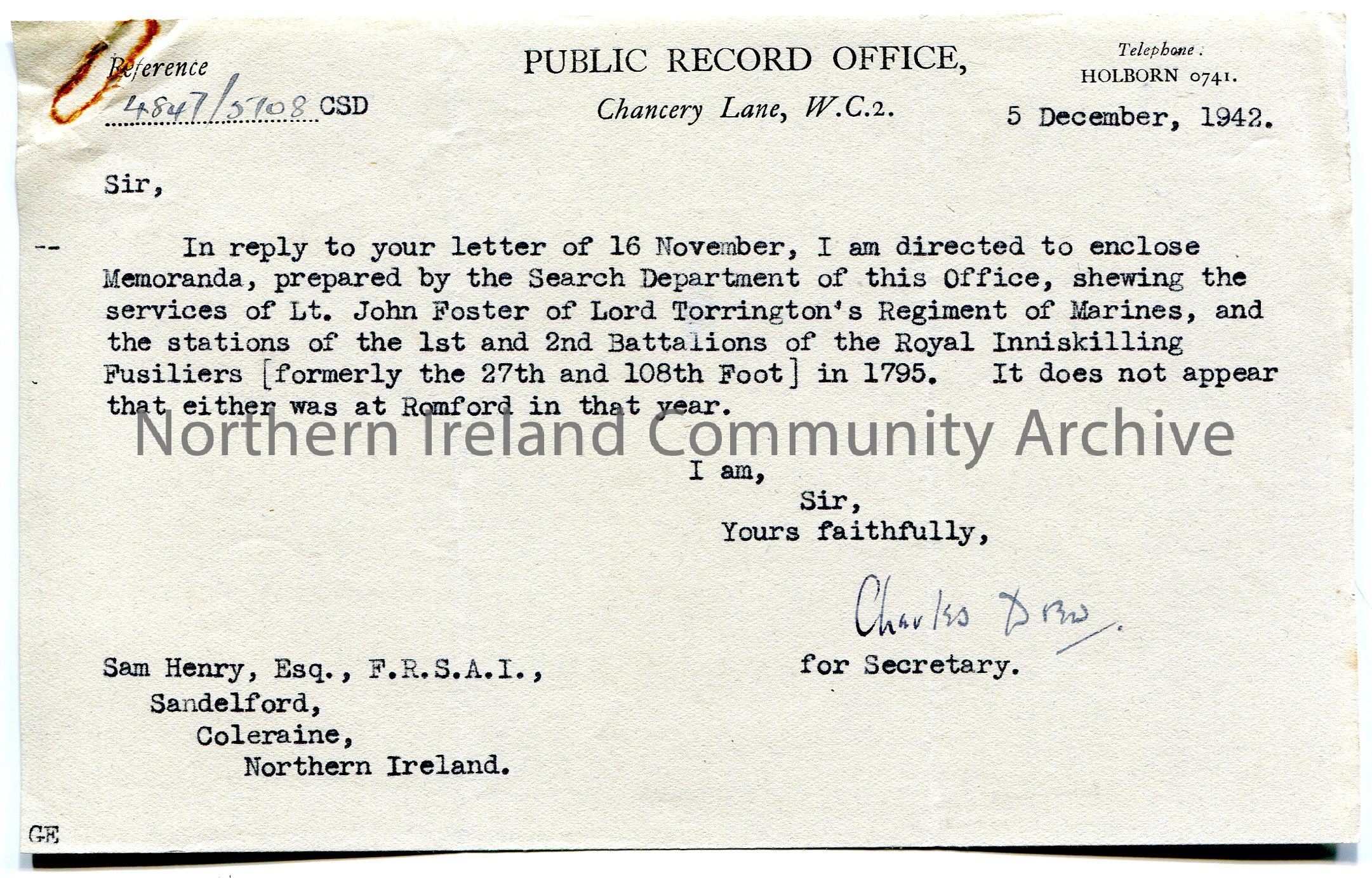 Page 1 of 2. Typed letter to Sam Henry. Writes that they enclose memoranda by the Search Department re Lt. John Foster and his military career.