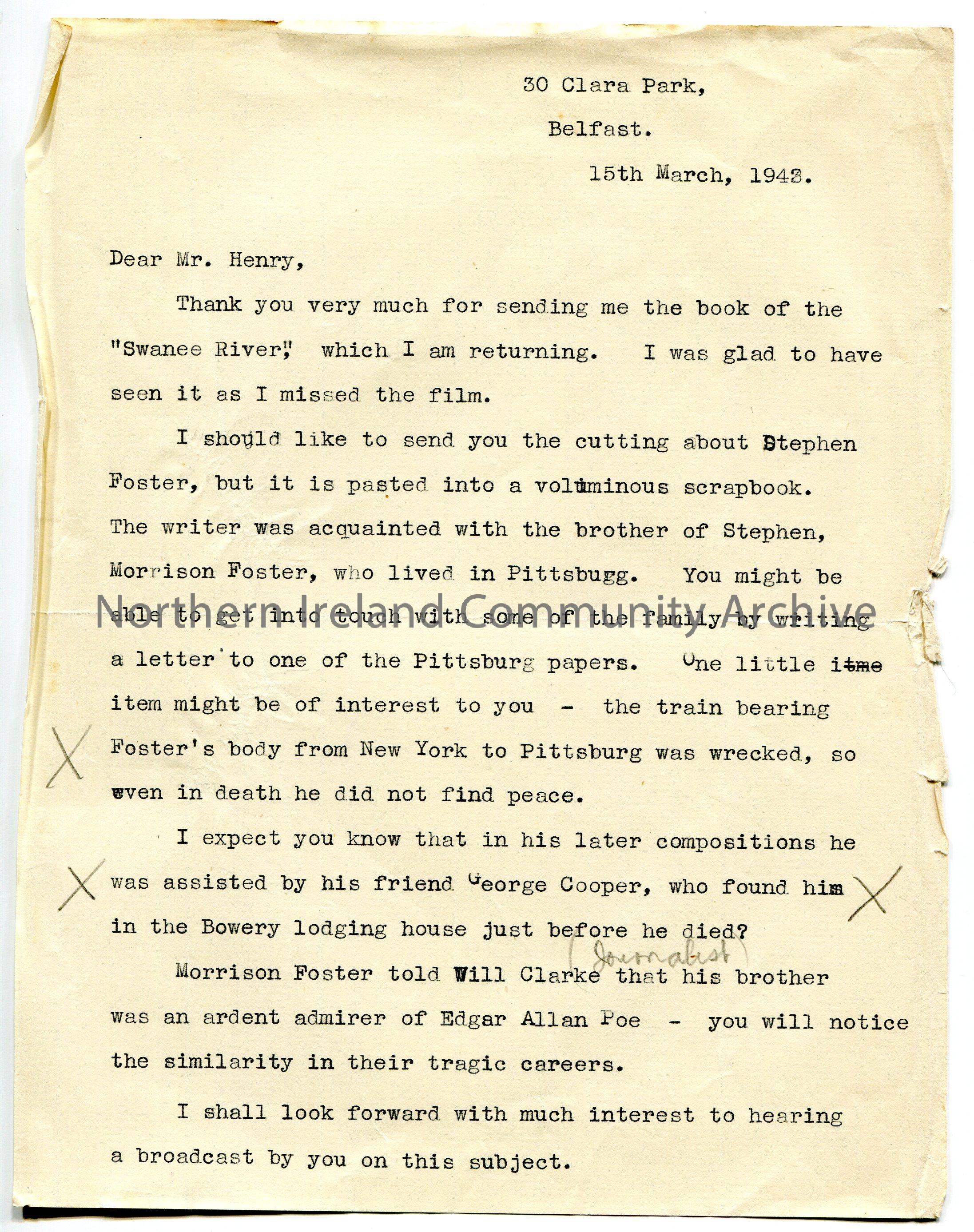 Page 1 of 2. Typed letter with handwritten post script to Sam Henry. Writing re Stephen Foster, the composer. Looks forward to Sam's broadcast on the subject and is interested to hear if Sam finds the connection between Stephen Foster and the Ulster family of Fosters.
