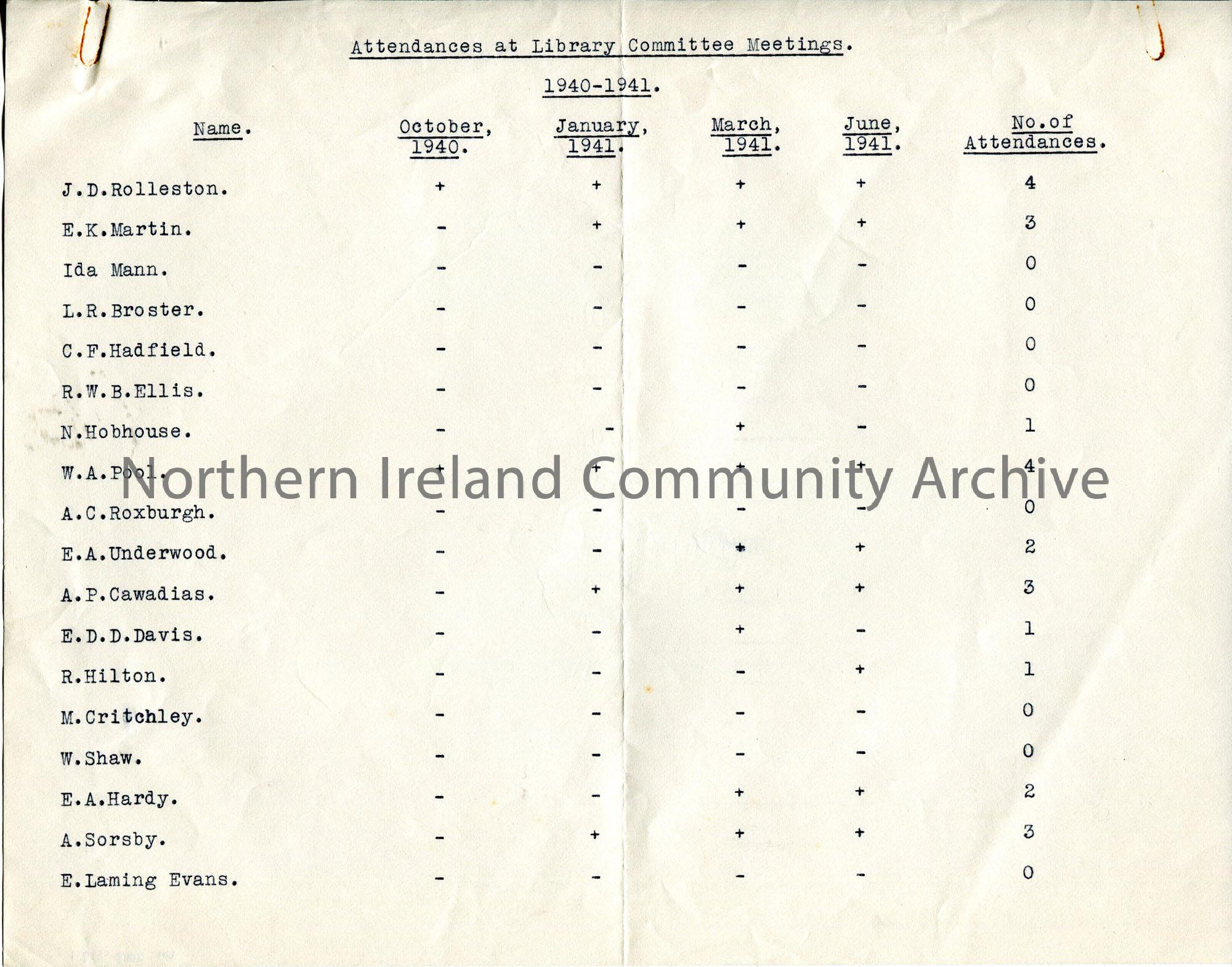 Page 1 of 2. Typed list of Attendances at Library Committee Meetings. 1940-41. Features names – Rolleston, Martin, Mann, Broster, Hadfield, Ellis, Hob…