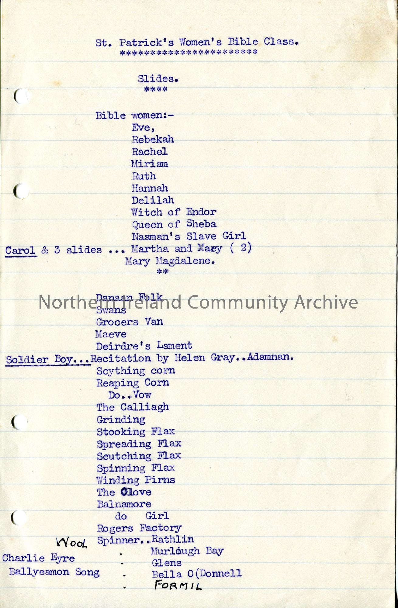 Page 1 of 2. Typed list of slides for St. Patrick's Women's Bible Class. Slides are categorised under 'Bible Women; Carol & 3 slides; Soldier Boy; Charlie Eyre; Ballyeamon Song; Turf; Sketch THE FLU; Ive McKay; The Old Woman; Benvarden Braes; Finvola; Rathkelly.