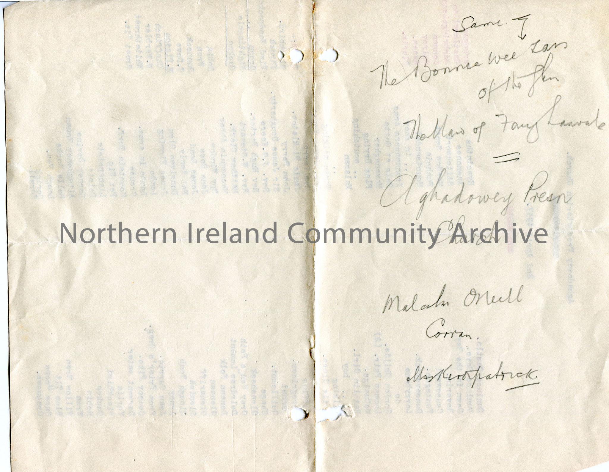 Page 1 of 2. Typed list, possibly of slides, for lecture at Aghadowey Presbyterian Church on 2nd April, 1937. List begins with ‘Dunluce Castle’ and en… – scan117b