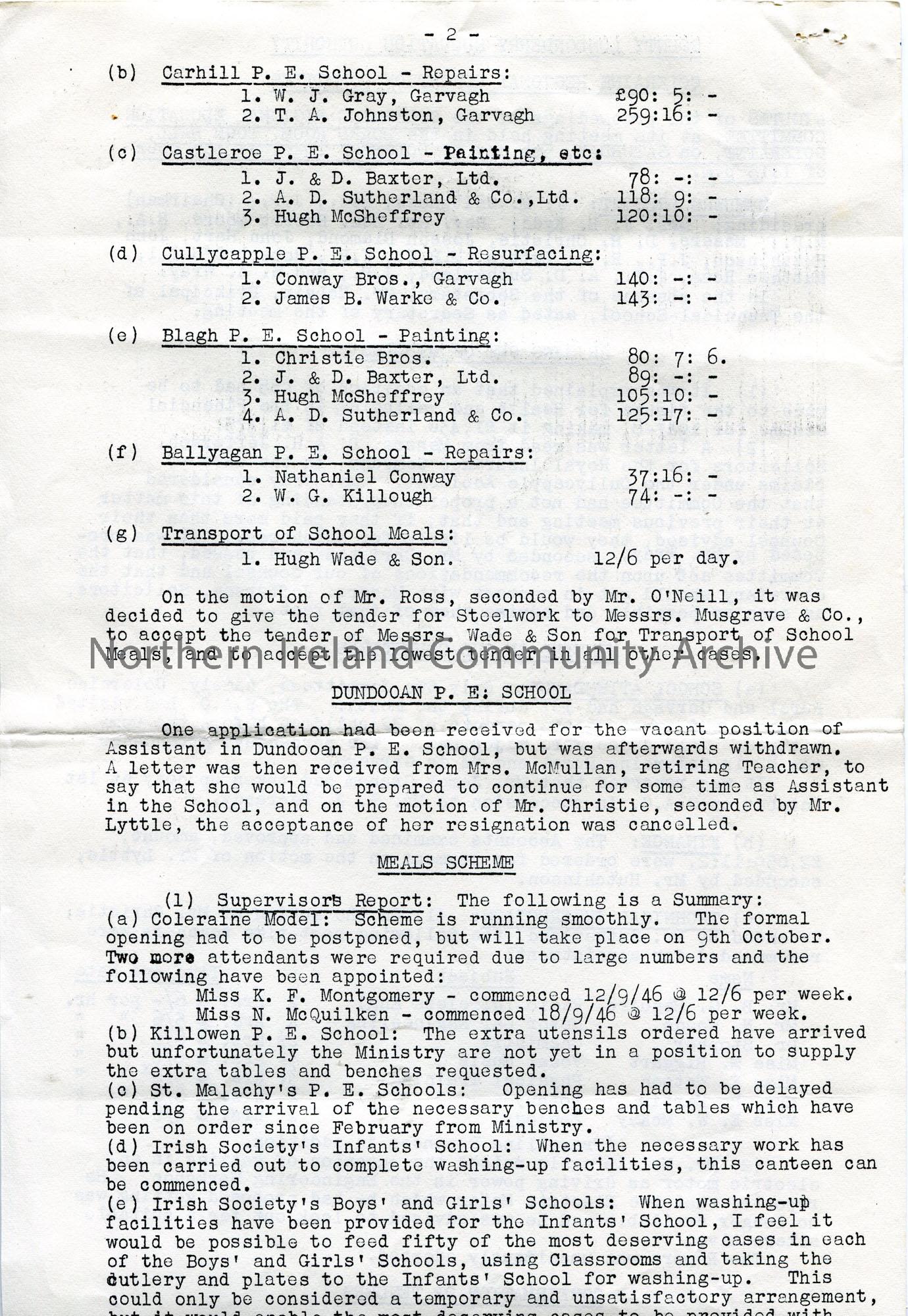 Page 1 of 2. Typed minutes of a meeting of Coleraine Regional Education Committee in Coleraine Town Hall on 5th October 1946 at 1.15pm. – scan014c
