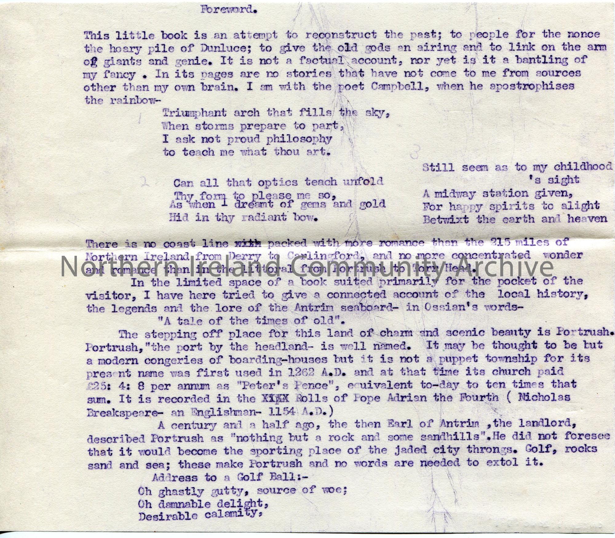 Page 1 of 2. Typed notes for draft of the foreword of Sam Henry's book 'Dunluce and Giant's Causeway'. Titled, 'Foreword'. It is titled as 'Introductory' in the book itself.