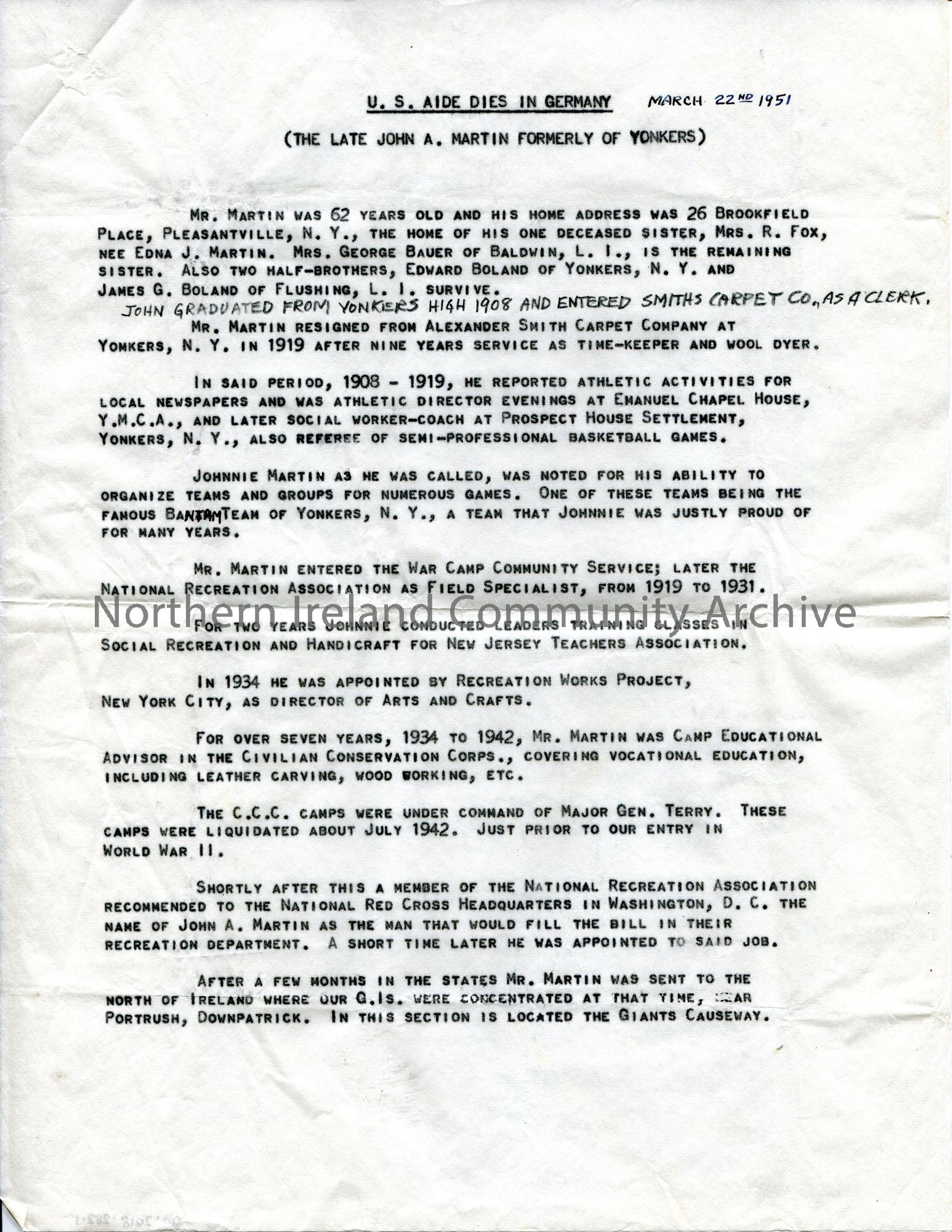 Page 1 of 2. Typed notes on the life and career of John A. Martin. Titled, 'U.S. Aide Dies in Germany (The Late John A. Martin Formerly of Yonkers)'. Mentions that he spent time in Northern Ireland where the GIs were concentrated near Portrush.