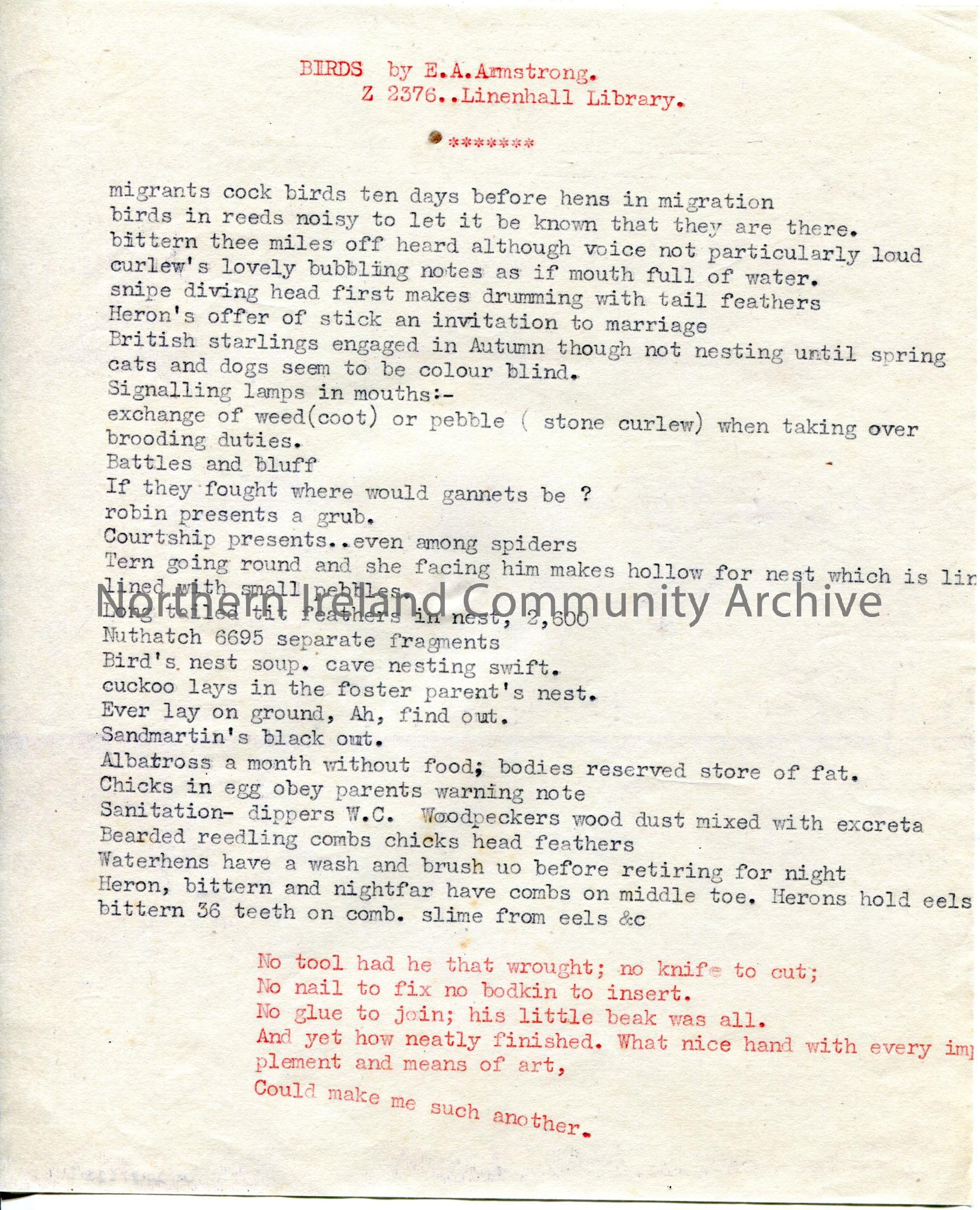 Page 1 of 2. Typed notes re birds taken from a book titled, ‘BIRDS by E. A. Armstrong. Z 2376..Linenhall Library’.