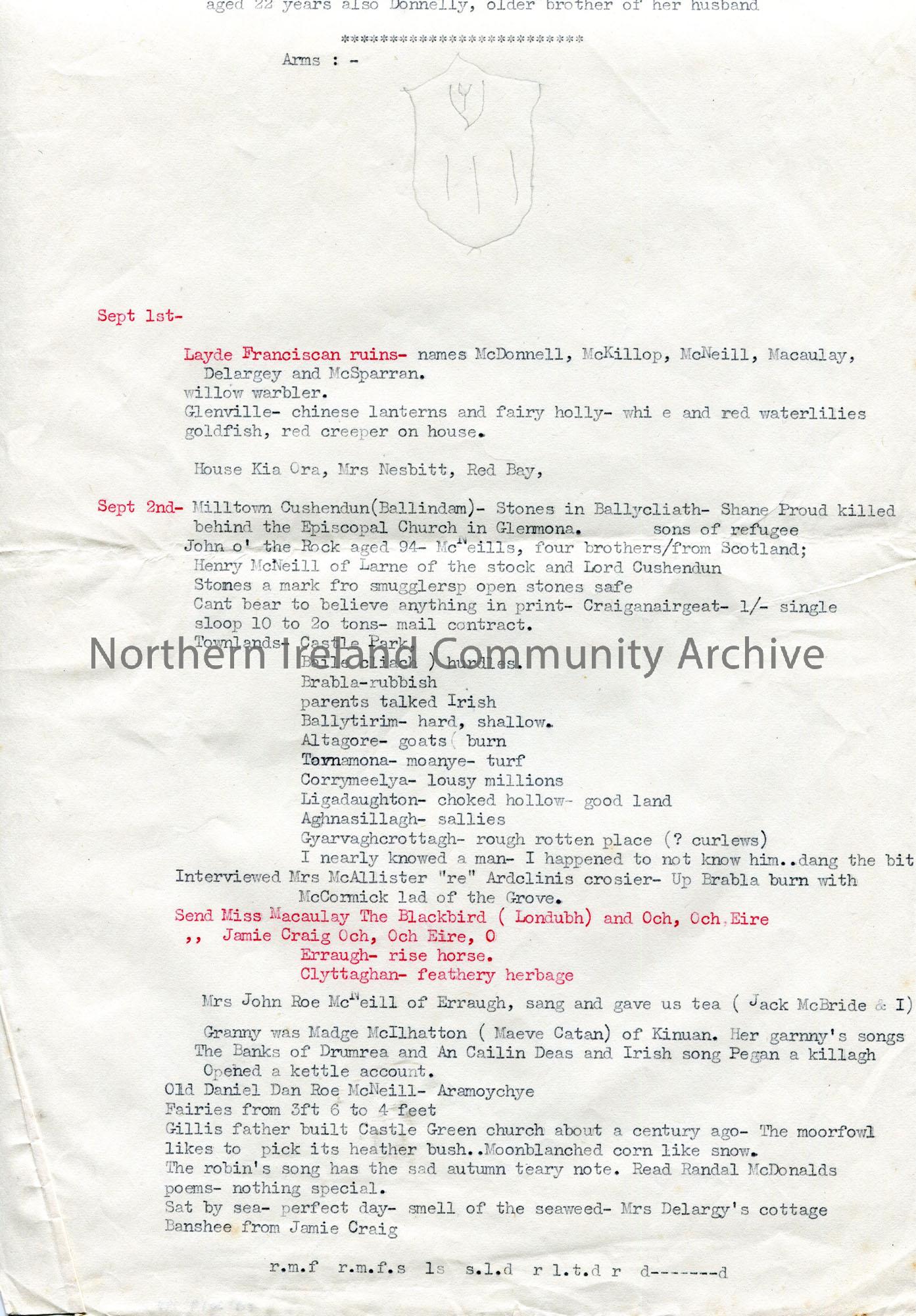 Page 1 of 2. Typed notes titled ‘Ardclinis continued’. Mentions the McKarys of Drumnacur; Layde Franciscan ruins, Glenville, Milltown Cushendun; McNei… – scan011b