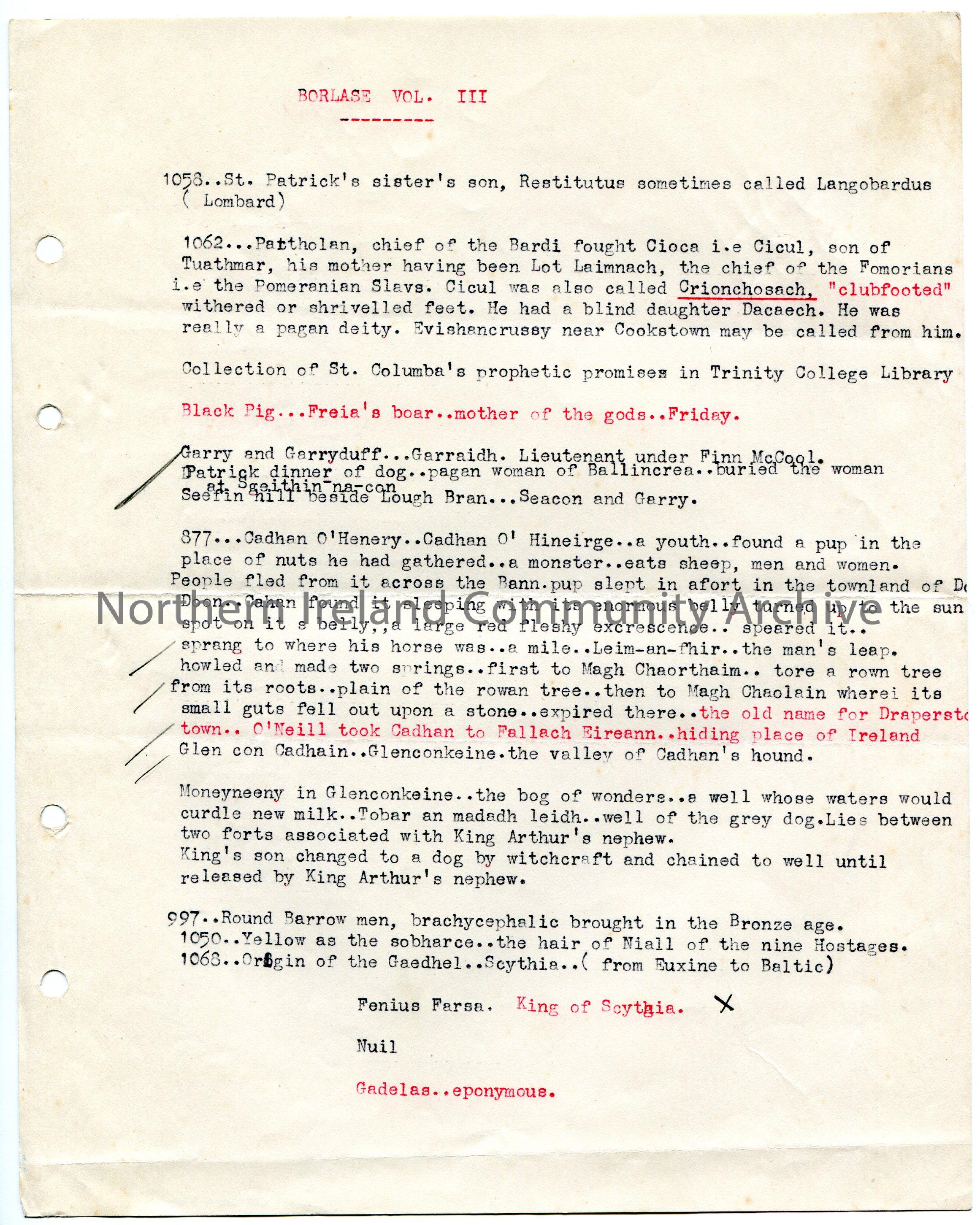 Page 1 of 2. Typed notes titled, ‘Borlase Vol. III’. Pencil marks beside some of the notes. Some notes are typed in red ink.