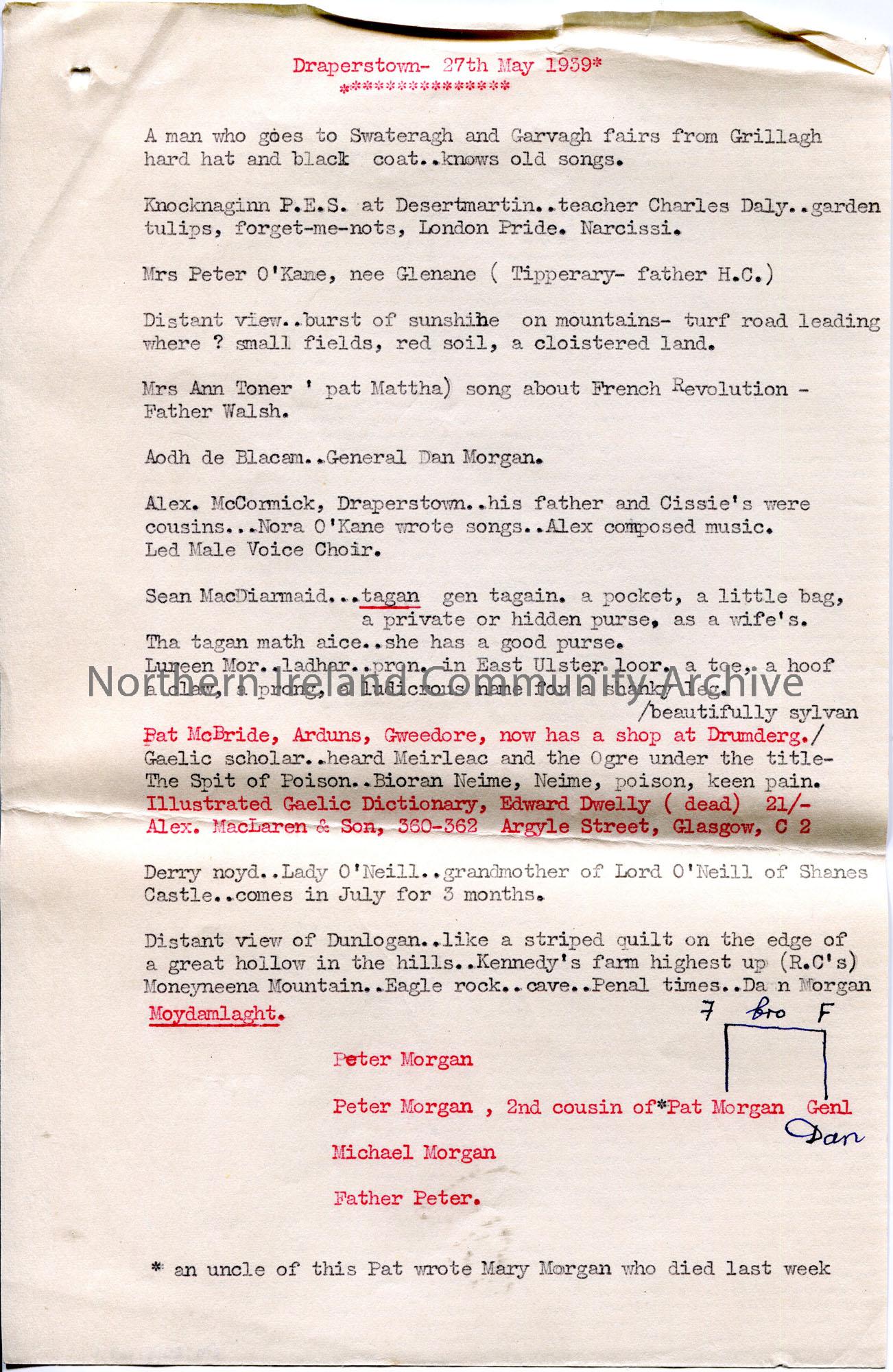 Page 1 of 2. Typed notes titled, ‘Draperstown – 27th May 1939’. Appears to be Sam’s interactions and experiences to Draperstown re General Daniel Morg…