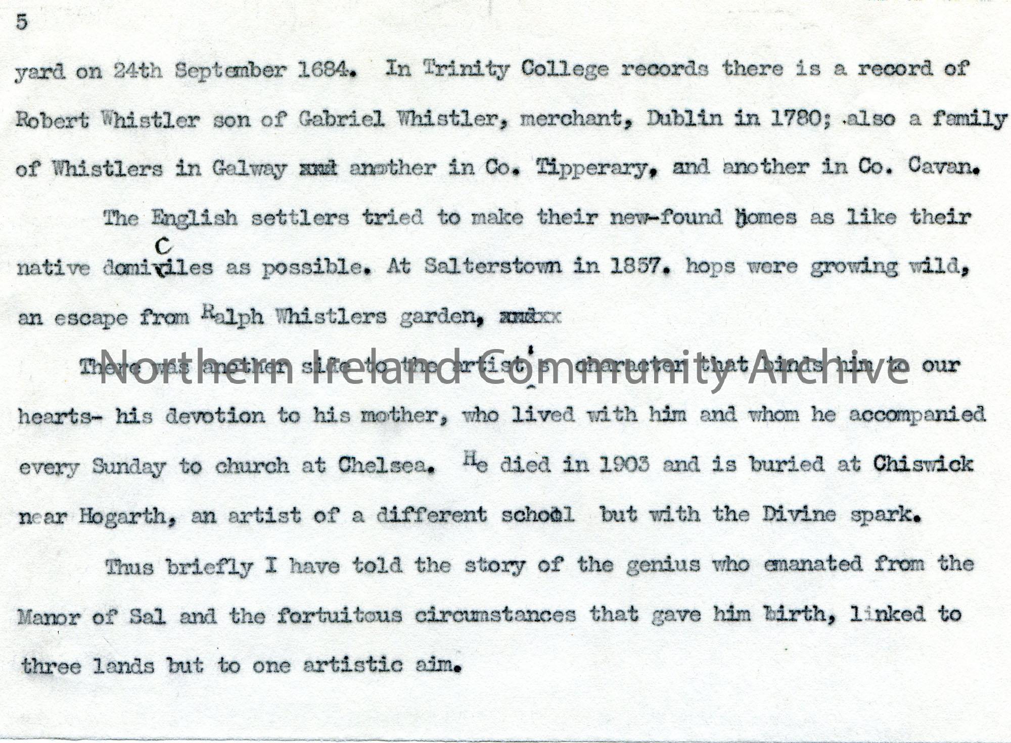 Page 1 of 2. Typed page re Whistlers. Page 5. Possibly part of a script.