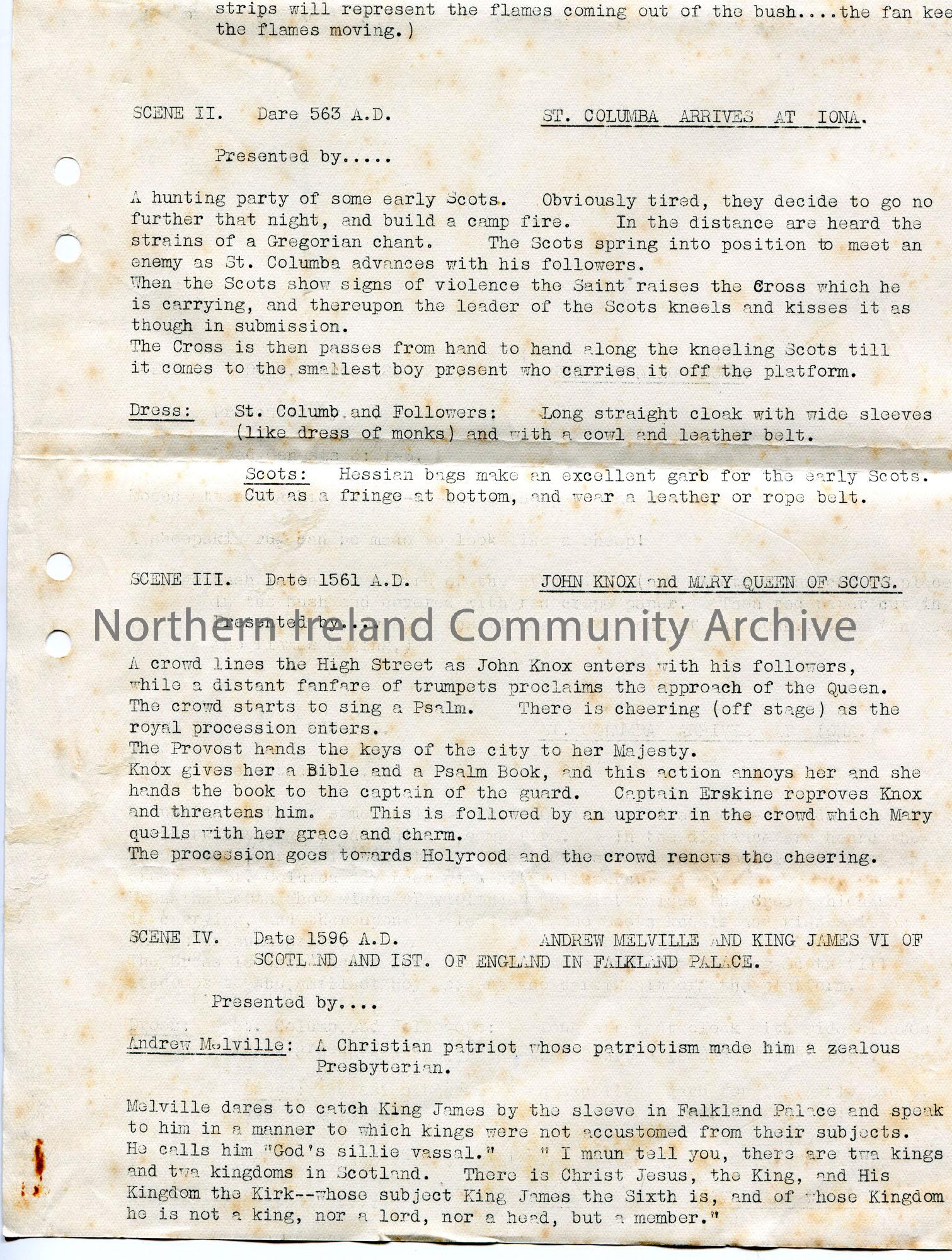 Page 1 of 2. Typed play with details of scenes, 17 in total. Re ancient history and Christianity. – scan069b