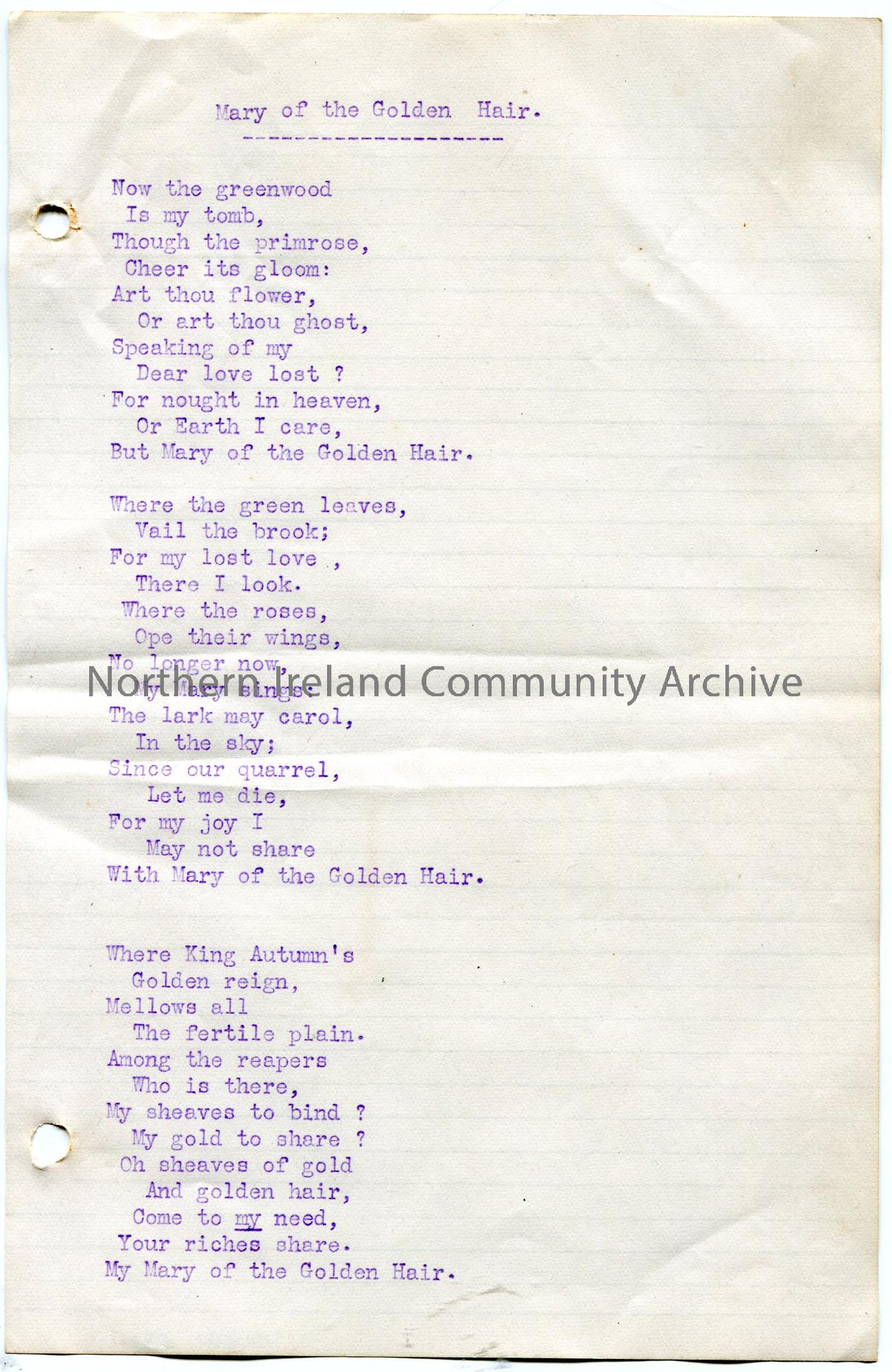 Page 1 of 2. Typed poem titled, ‘Mary of the Golden Hair’ by Sam Henry.