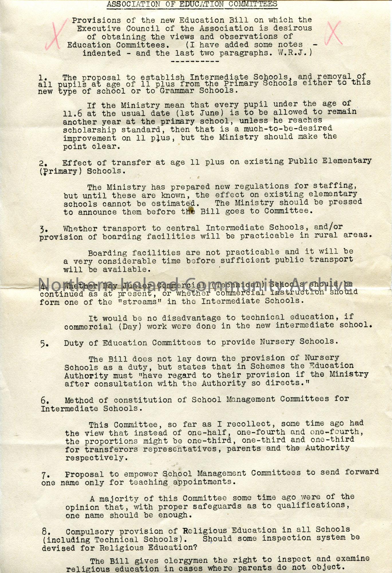 Page 1 of 2. Typed provisions of the new Education Bill. Typed by W R Johnston, Secretary of Coleraine Regional Education Committee who has added additional notes.